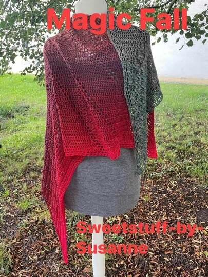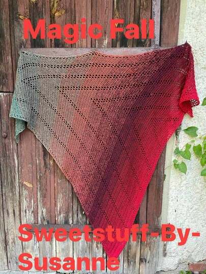 „Magic Fall“ ist ein wärmendes Schultertuch, welches von der Spitze aus nach oben mit Zunahmen an beiden Seiten gearbeitet wird.