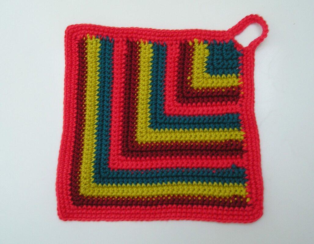 Der Motivtopflappen wird mehrfädig mit festen Maschen gehäkelt. Dabei hat man einen Arbeitsfaden und mehrere Ruhefäden. Während man mit dem Arbeitsfaden Maschen häkelt werden die Ruhefäden von den festen Maschen mit umhäkelt. Dadurch bilden die Ruhefäden auf den Rückseite keine langen Schlaufen und sind fast unsichtbar. Das ist nicht besonders schwierig und auch für Häkelanfängerinnen gut zu bewältigen. Die Anleitung enthält eine ausführliche textliche Beschreibung sowie eine Häkelschrift.