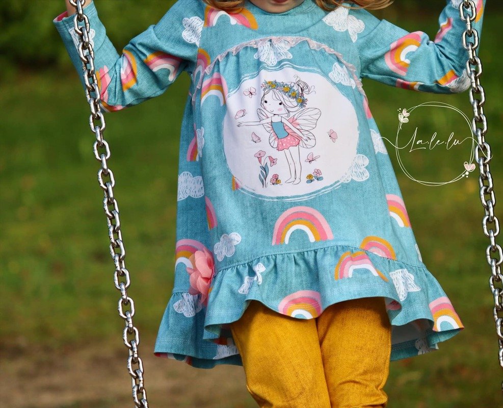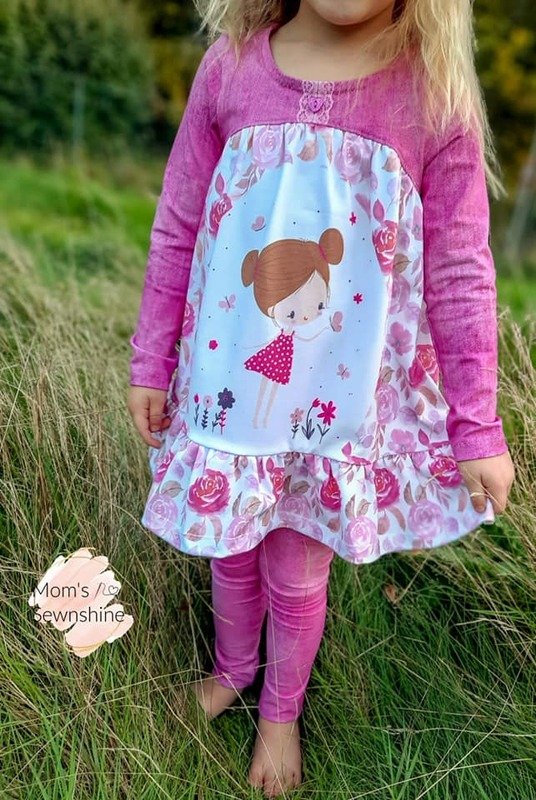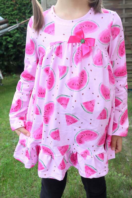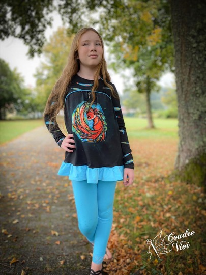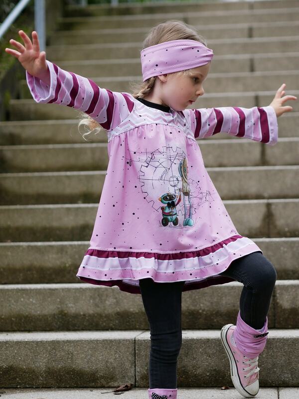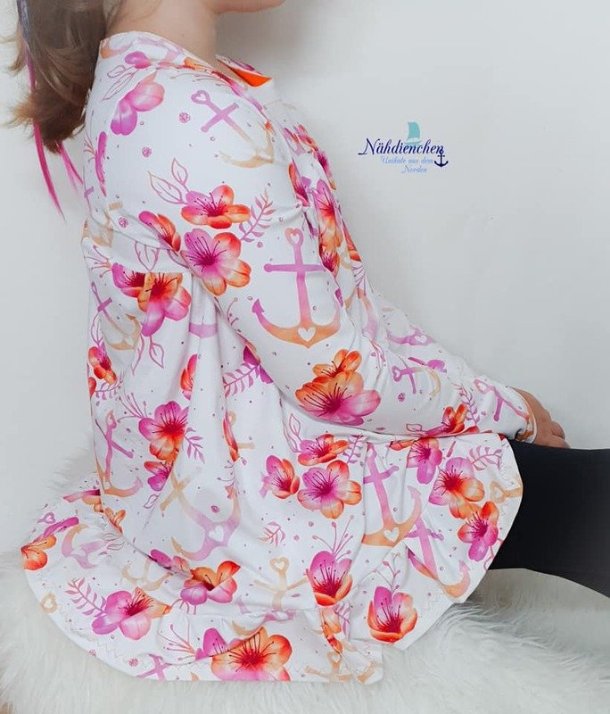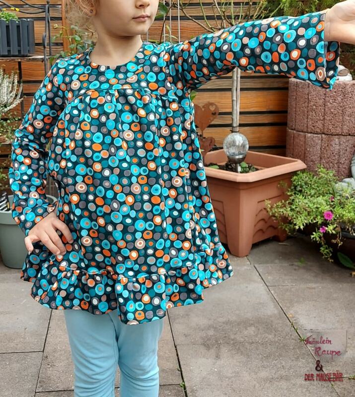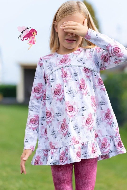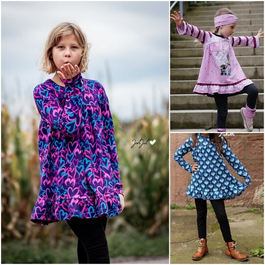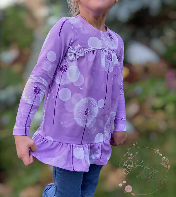 Die Tunika ist nähbar von Gr. 104 – 164 jeweils in Einzelgrößen, und das idealerweise aus Jersey. Auch Sommersweat ist nutzbar. Am Hals kannst du einen Beleg annähen oder ein Bündchen nutzen – ganz wie es dir gefällt.