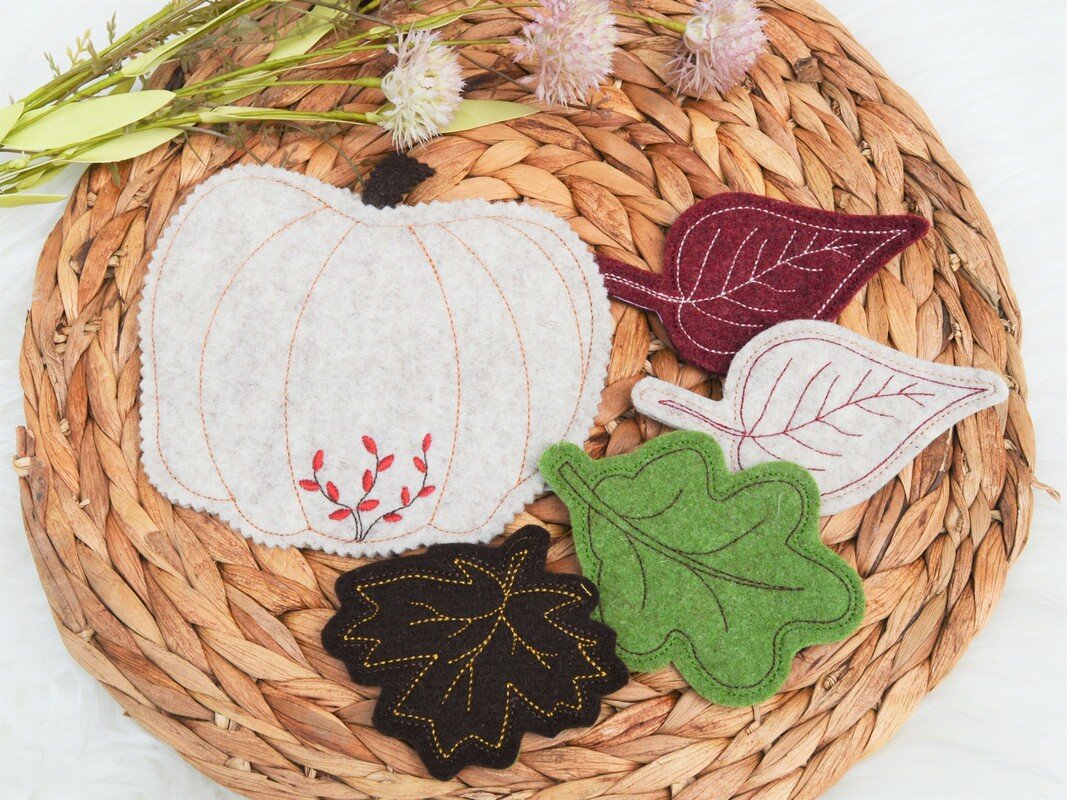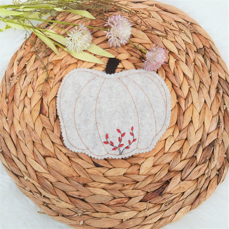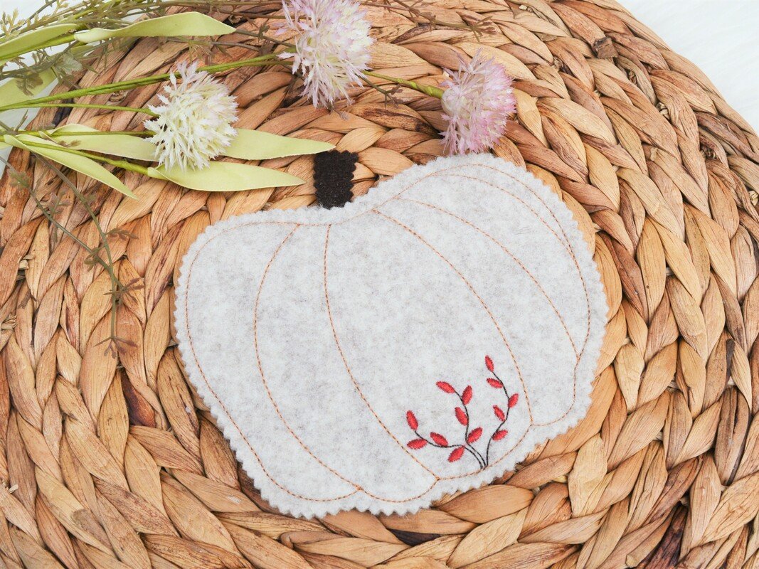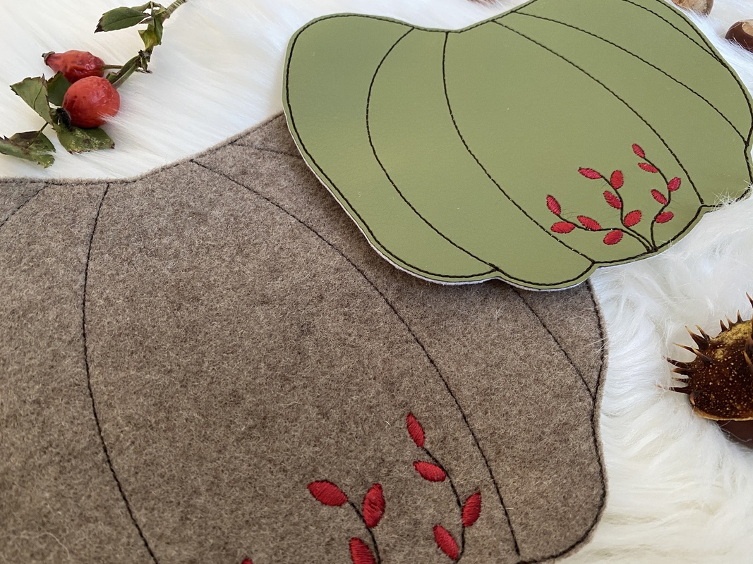 Die Kürbisse werden kompett im Stickrahmen gestickt, eine Rückseite wird mit angenäht, so verschwindet die Rückseite im Innern der Stickere.