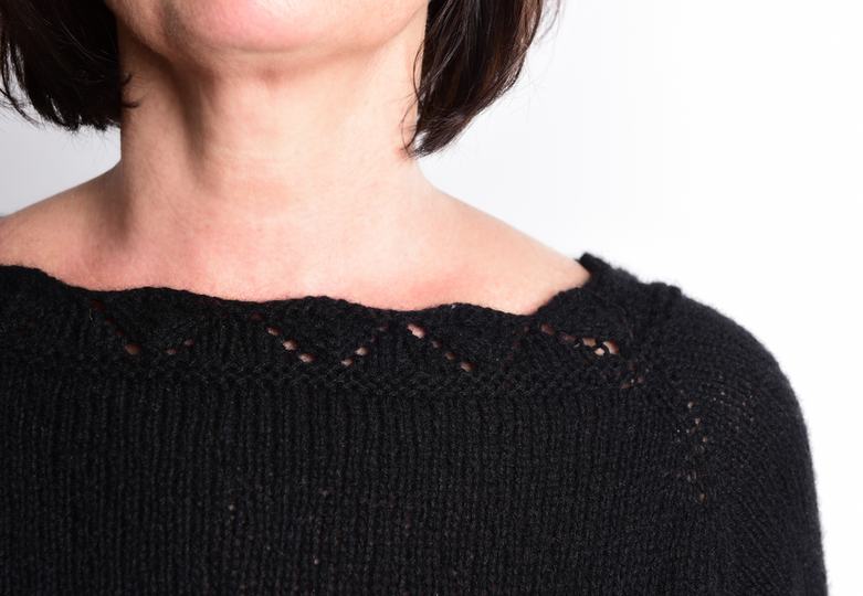 Jetzt wird's kuschelig! Dieser Pullover (hier gestrickt aus reinem Kaschmir) wird von oben nach unten in einem Stück gestrickt, hat eine dezente Lacebordüre am Halsausschnitt und eine rückwärtige Knopfleiste. Die Knöpfe sind hier nur aufgenäht, es müssen also keine Knopflöcher gestrickt werden.