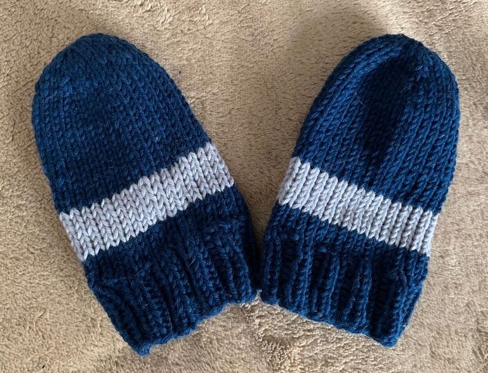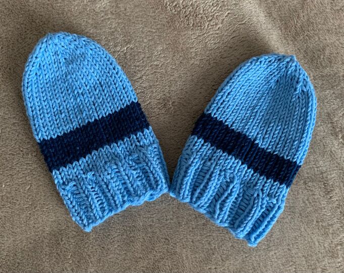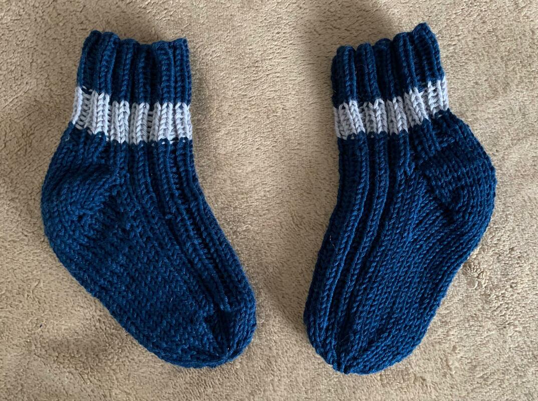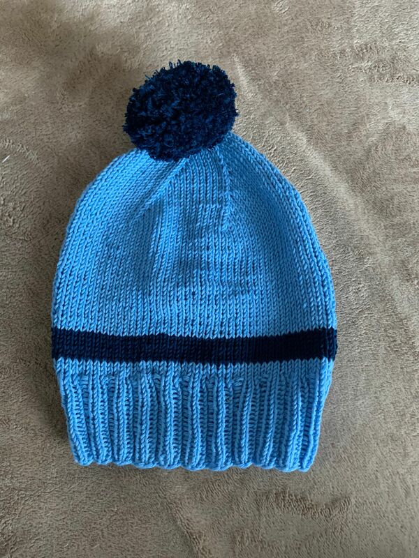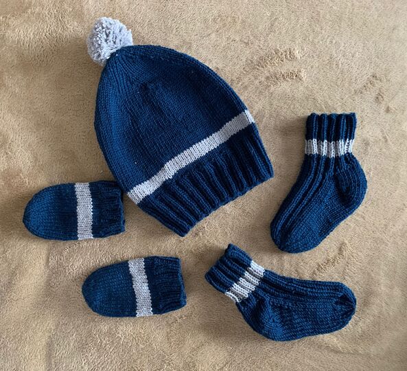 das Babyset zum nacharbeitet besteht aus Mütze mit Bommel, Fäustlinge, Söckli