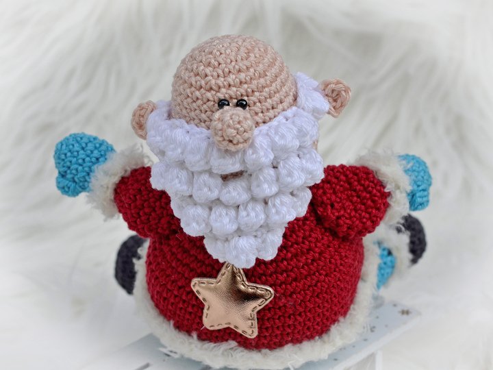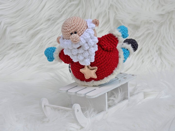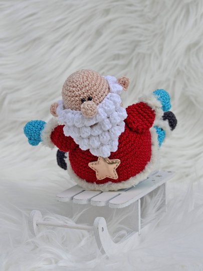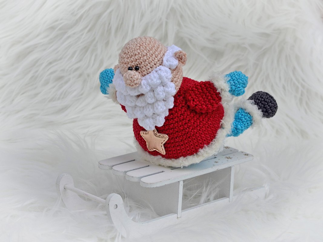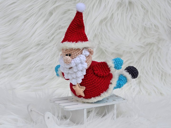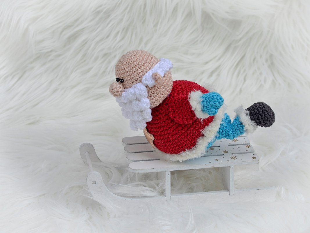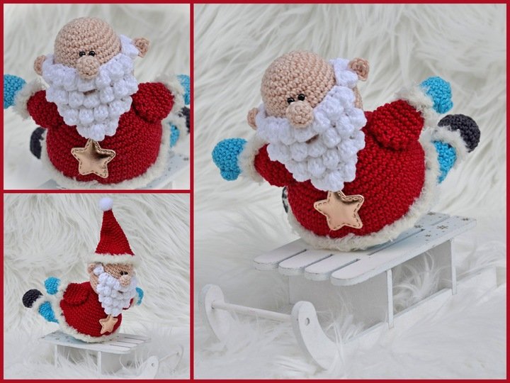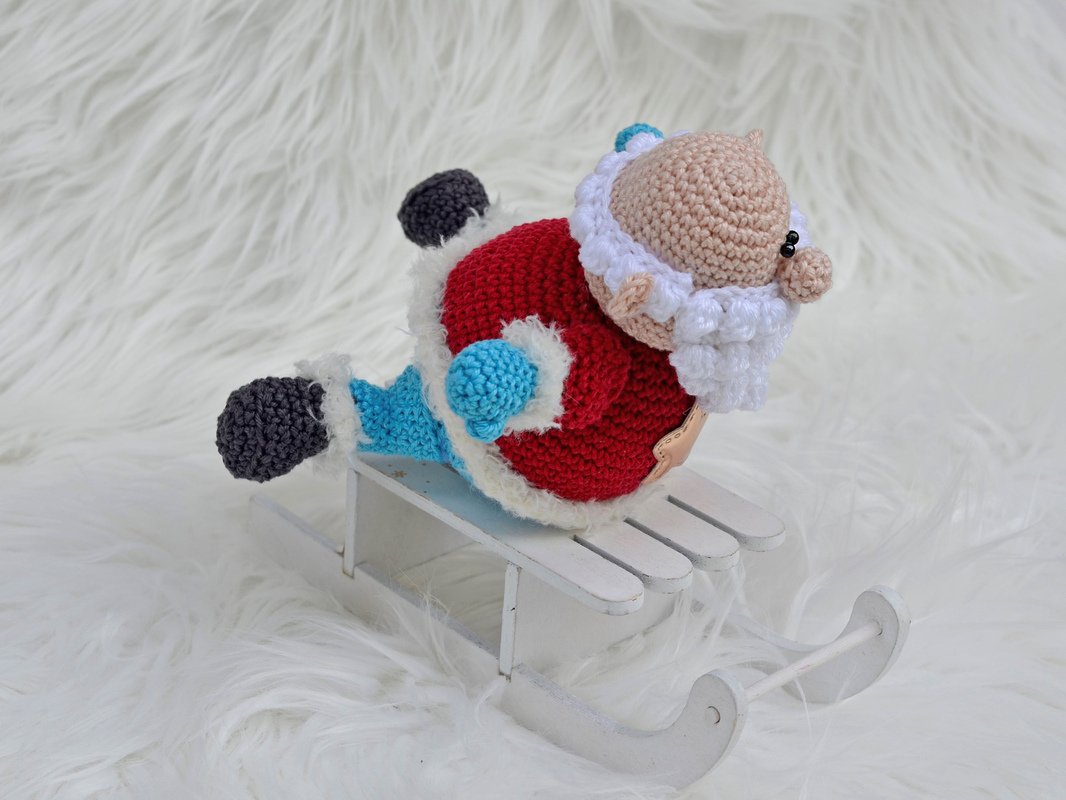 Mit dieser Häkelanleitung zeige ich dir, wie du diesen kleinen Nikolaus liegend in Fliegerposition auf einem Schlitten häkeln kannst.