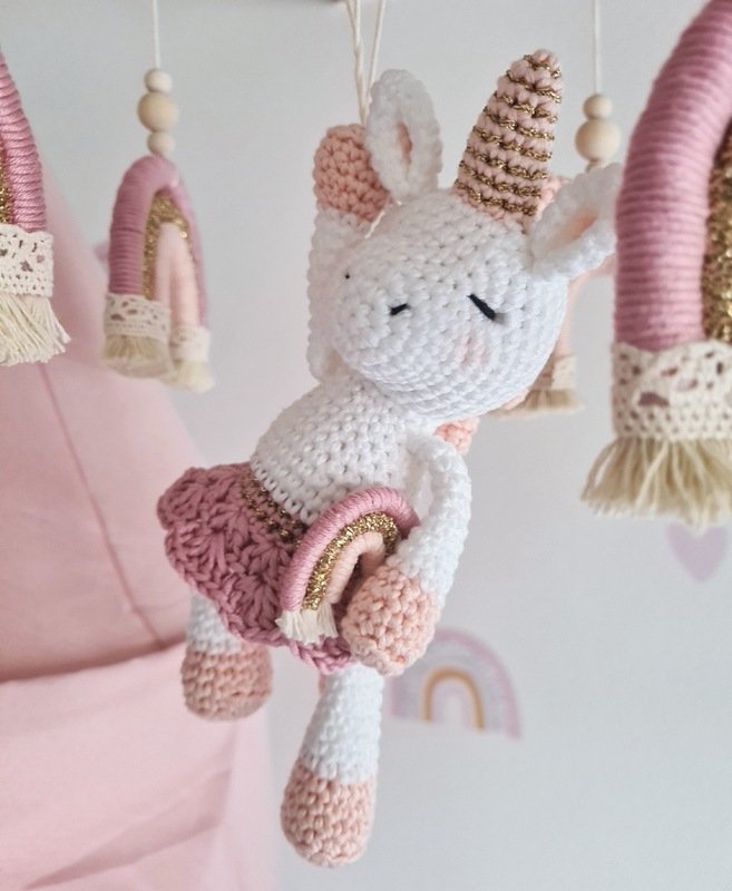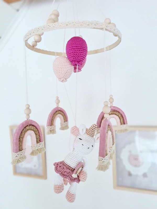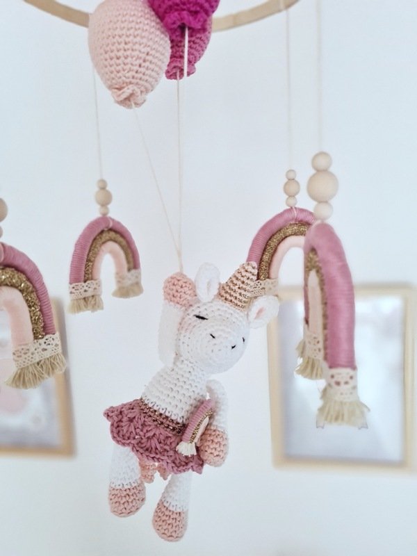 Das Einhorn wird ca. 20 cm groß (von Horn-Fuß gemessen). Die Größe des Mobiles kann variieren, je nachdem wie lang deine Schnüre sind. Meins beträgt ca. 62 cm groß!