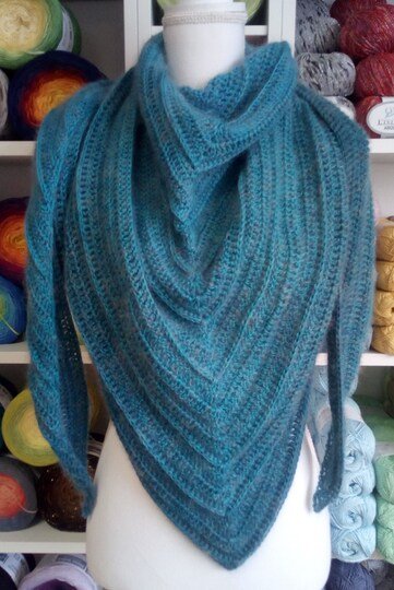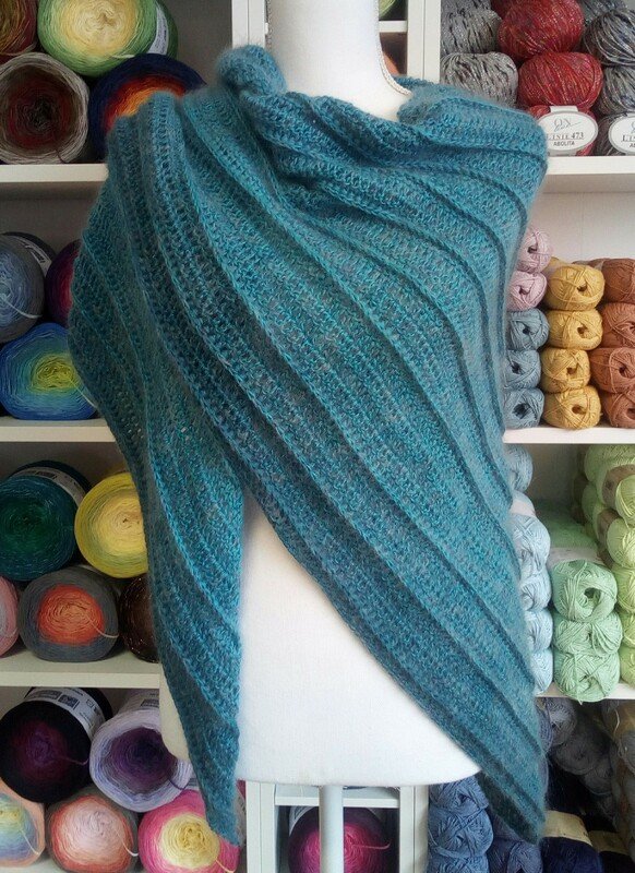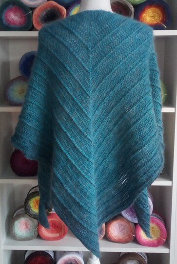 Mit einem 4 Fädigen Bobbel wird das Tuch an der Halskante ca. 180 cm lang und 65 cm tief bis zur Spitze.