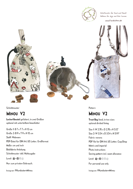 Nähanleitung und Schnittmuster für einen Leckerlibeutel, optional mit geteiltem Innenfutter für 2 Fächer, in 2 Größen.