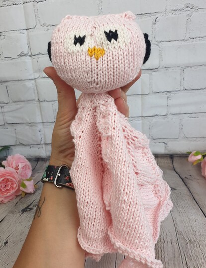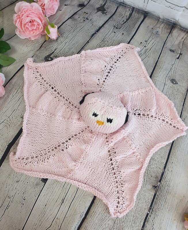 Dies ist eine Anleitung für einen supersüsses Eulen Kuschel – Schmusetuch (Schnuffeltuch). Die Basis ist in Runden gearbeitet von innen nach aussen mit zunahmen und abnahmen in jeder 2. Runde was ein ganz spezielles Muster ergibt, beinahe wie eine Muschel. Das Gesicht ist mit Swiss Darning (Maschenstich) gearbeitet. Infos dazu sind in der Anleitung inklusive.