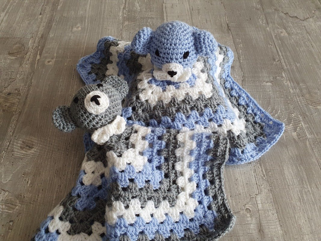 Hochwertige, speichelechte Babywolle wie zum Beispiel die Charity von Woolly Hugs für Nadelstärke 3,5, in 4 verschiedenen Farben. Damit wird das Bärchen Schnuffeltuch schön weich für Babys Händchen.