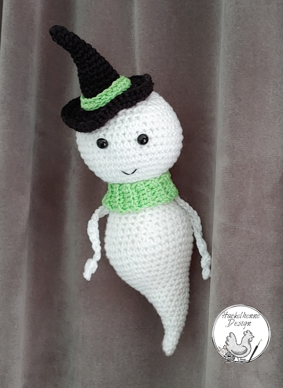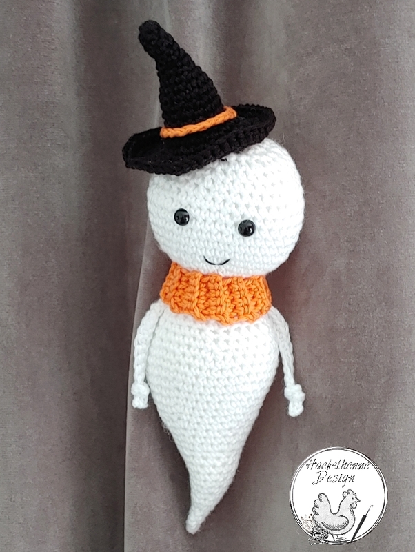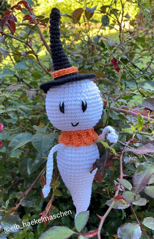 Das Gespenst ist ca. 23 cm lang. Das Maß erstreckt sich vom Hut bis zum Schwänzchen. Gearbeitet habe ich es mit einer 2,5 mm Häkelnadel. Wenn du anderes Garn oder eine andere Nadelstärke verwendest variiert das Maß.
