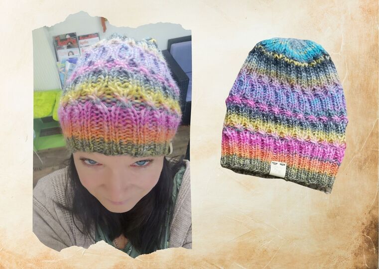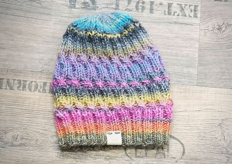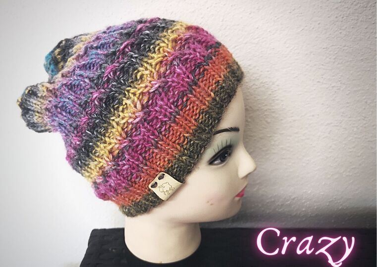 Man nehme ein witzig buntes, etwas verrücktes Garn und ein tolles, einfaches Muster, das nur aus rechts links und verkreuzten Maschen besteht....und schon hat man, nach ein paar Stunden eine individuelle kunterbunte Mütze die auffällt...natürlich spricht auch nichts gegen unfarbigere Wolle ....