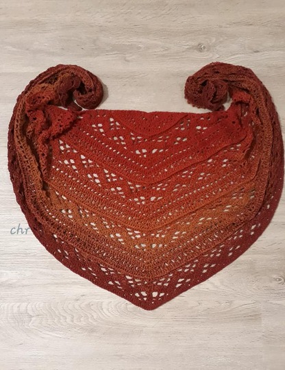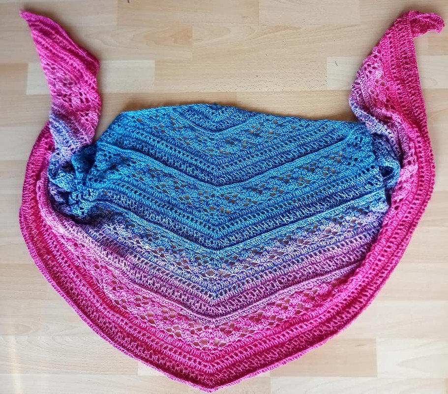 Die flache Variante des „Sueño“, ist im Gegensatz zur klassischen Variante, länger und nicht so tief gearbeitetes Dreieckstuch.
