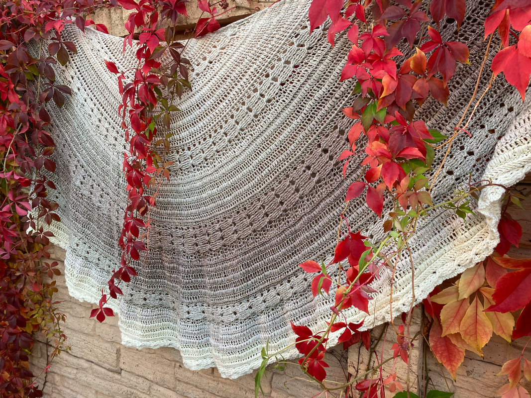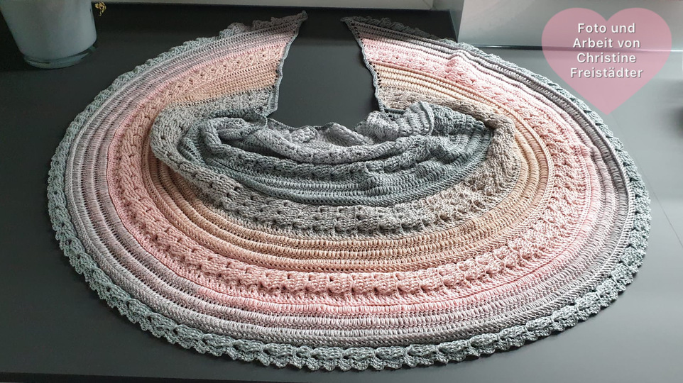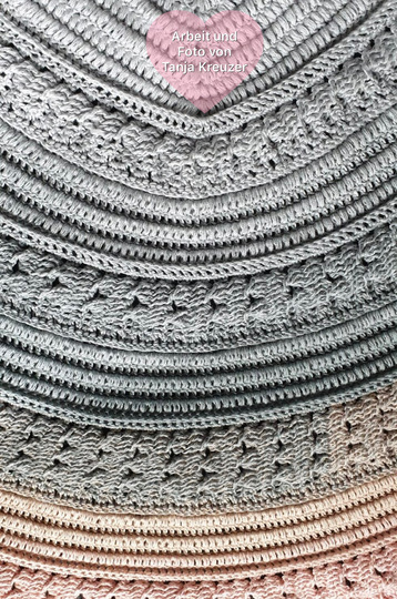 Das Besondere an diesem Tuch ist, dass sich hier zwischendrin die Häkelrichtung komplett ändert und hier keine Maschenkontrollangaben Vonnöten sind, weil das Tuch ab Teil 2 einfach komplett von links nach rechts durchgehäkelt wird, ohne das großartig bewusste Zunahmen gemacht werden müssen. Wie das funktioniert, wird in der Anleitung genau erklärt. :)