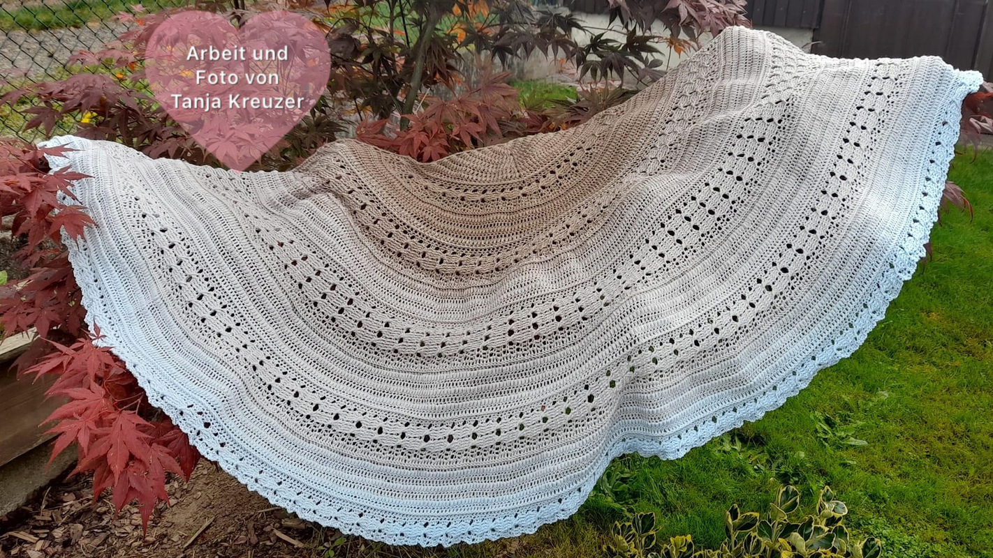 Bitte denke daran, dass die Größe des Tuches auch immer sehr stark von deinem Häkelstil und der Garnstärke abhängt und es daher Abweichungen geben kann.
