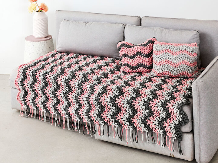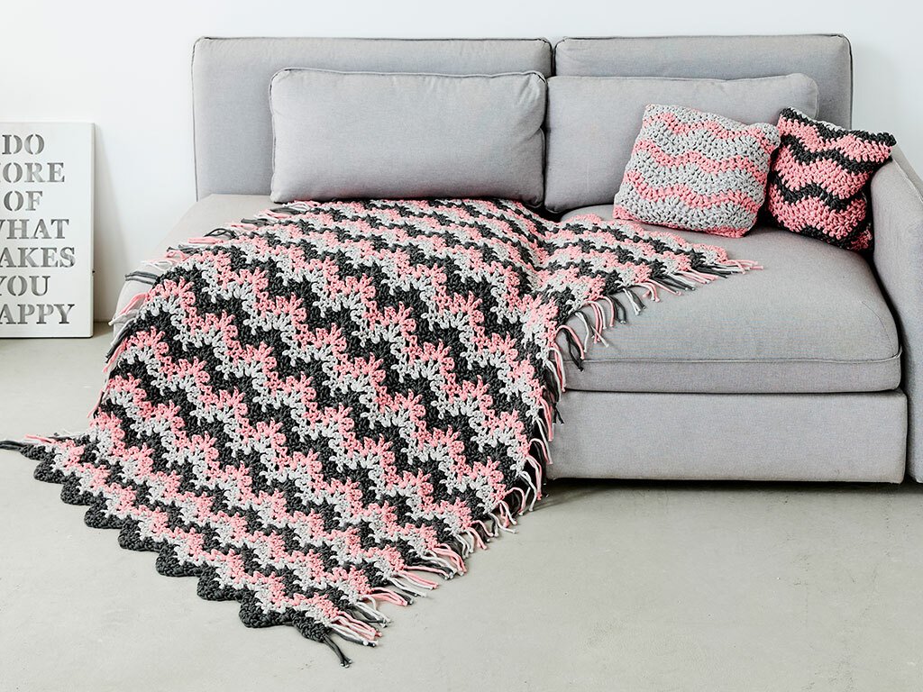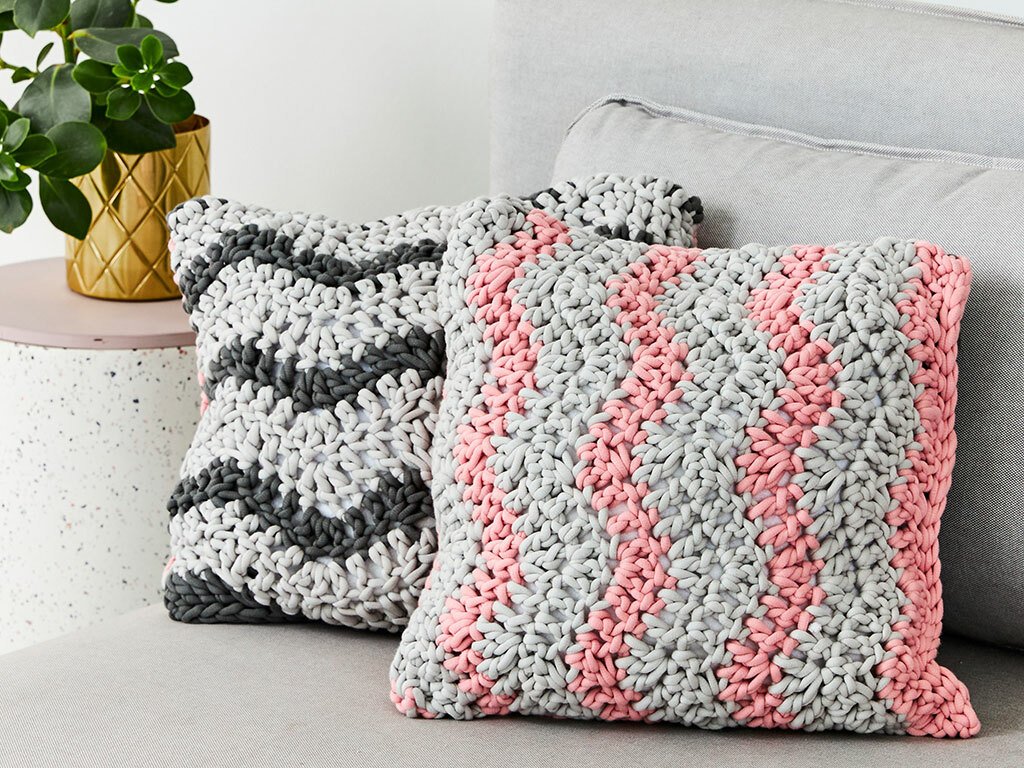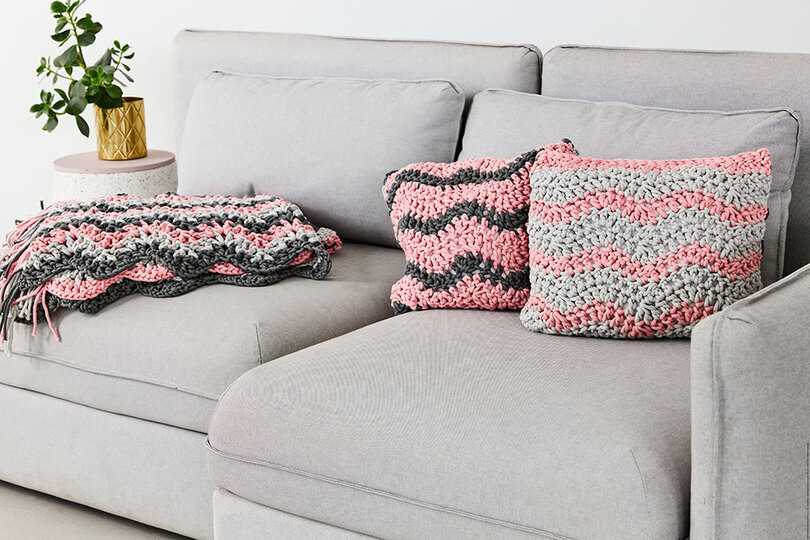 Eine Decke und die passenden Kissen gehören einfach zusammen. Dieses tolle Set ist wegen der großen Nadelstärke super schnell gewerkelt.