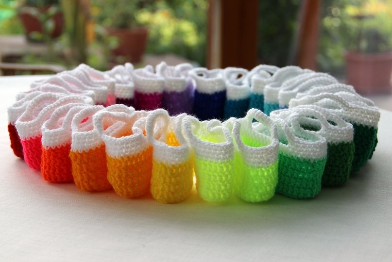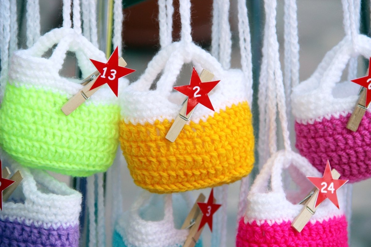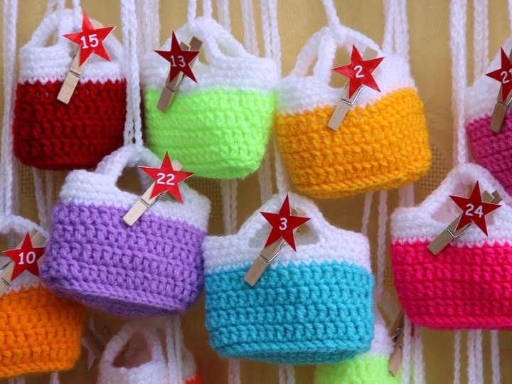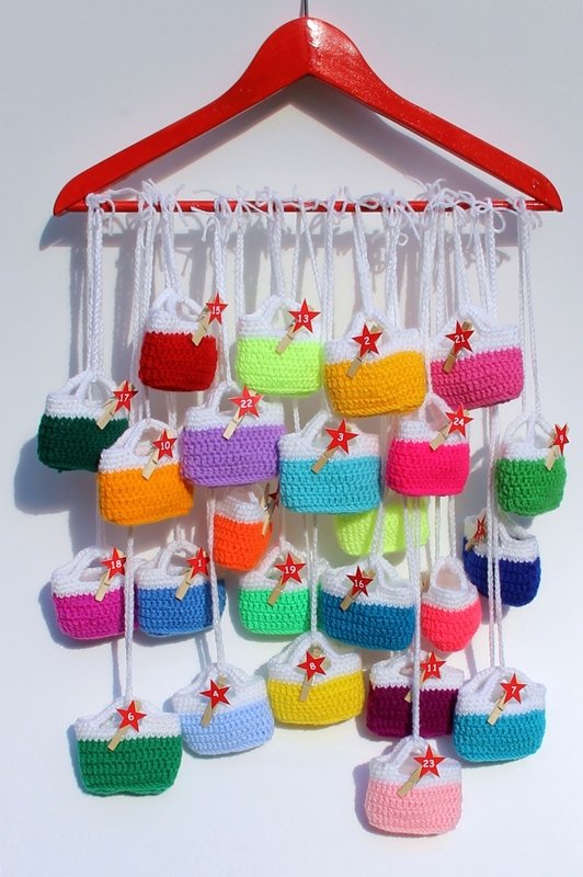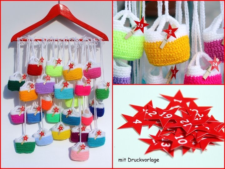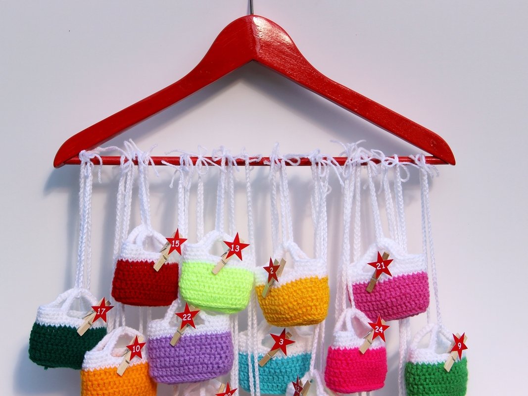 Mit diesem bunten Weihnachtskalender ist eine fröhliche Vorweihnachtszeit für Eure Kinder, Enkelkinder oder Eure beste Freundin garantiert. Die kleinen bunten Täschchen sind aus Wollresten fix gehäkelt. Man könnte sie weihnachtlich dekoriert auf einem Tablett arrangieren oder - wie ich - an einen Kleiderbügel hängen. Den Weihnachtskalender kann man so überall hinhängen oder auch gut gefüllt verschenken.