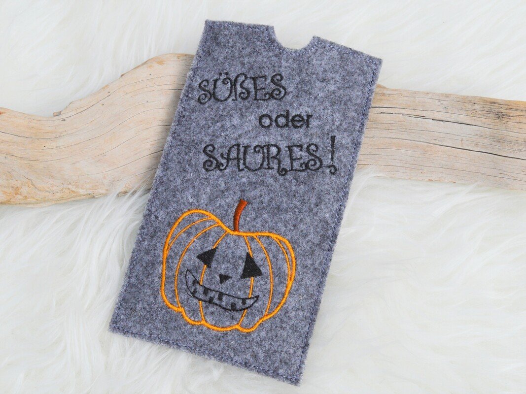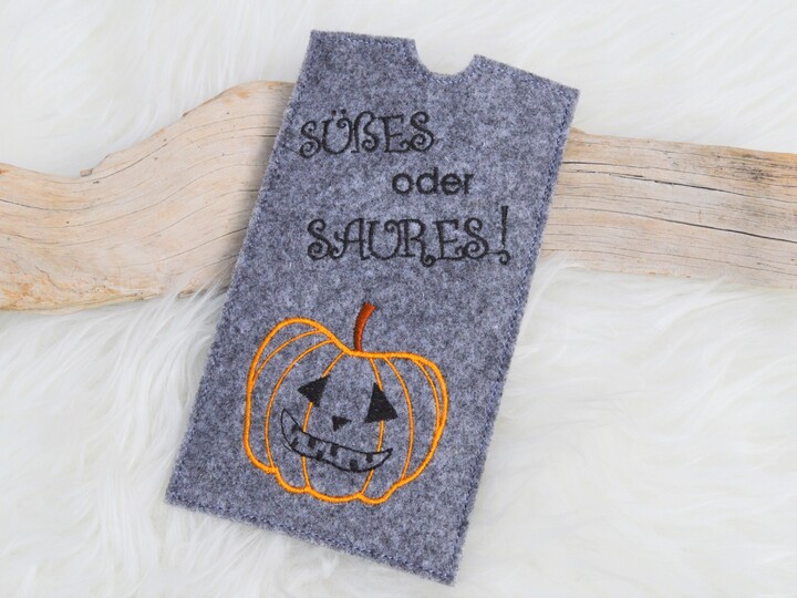 Die Hülle mit Kürbis ist zusätzlich ohne Text enthalten, hoer können eigene Sprüche aufgestickt werden.