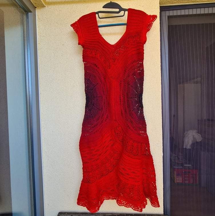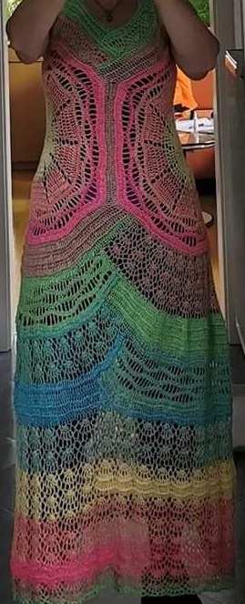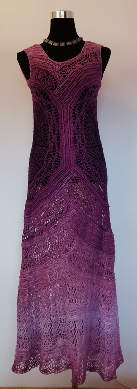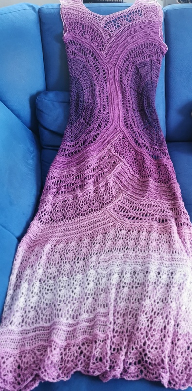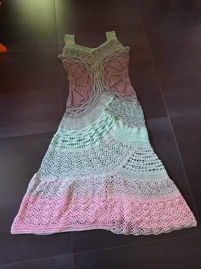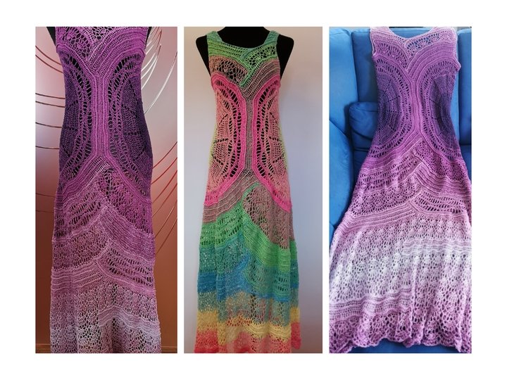 Die Bobbel müssen zerteilt werden, es wird je nach Größe einiges übrigbleiben und sich damit ev. auch noch ein Bolerojäckchen o.ä. zum Kleid ausgehen. Mit kleineren Bobbeln sollte nicht gehäkelt werden, um den Farbverlauf in den Mustern einhalten zu können.