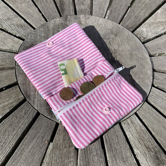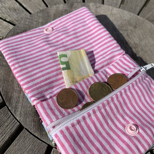 Sie hat ein Fach mit Reißverschluss für das Kleingeld und ein Fach dahinter für die Scheine.
