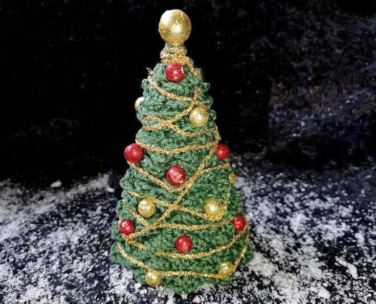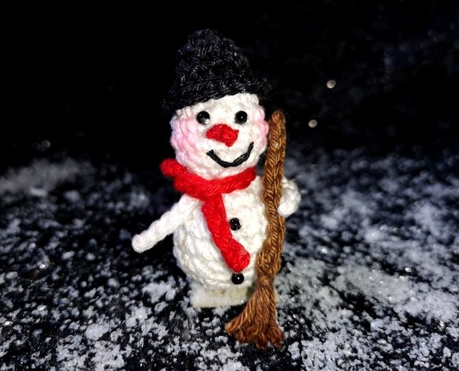 Bei Verwendung der genannten Materialien und Nadelgrößen wird ein Püppchen ca. 6 cm, der Schneemann ca. 6 cm und der Tannenbaum ca. 13 cm. groß.