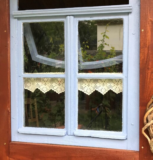 Ich habe bei den Flügelfenstern 2 Gardinen gehäkelt. Das geht relativ schnell, da sie klein sind.
