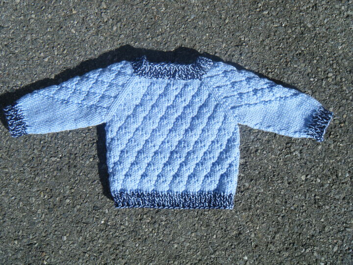 Je nach Größe 100-200g „Baby Milk“ von Pro Lana in hellblau (Farbe 53) und 25g in dunkelblau (Farbe 50) (25g = 100m). Der ganze Pulli wird 2-fädig gestrickt. Außerdem ein Nadelspiel 3,5mm und 1 Rundstricknadel 3,5mm 40cm lang
