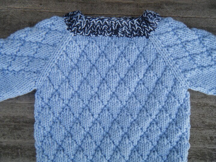Der Pulli wird in einem Stück vom Halsausschnitt zur Hüfte gestrickt.