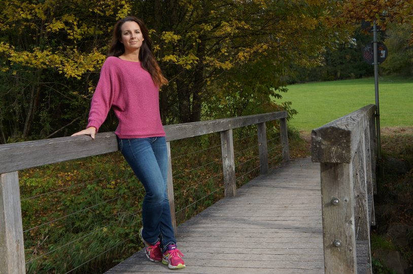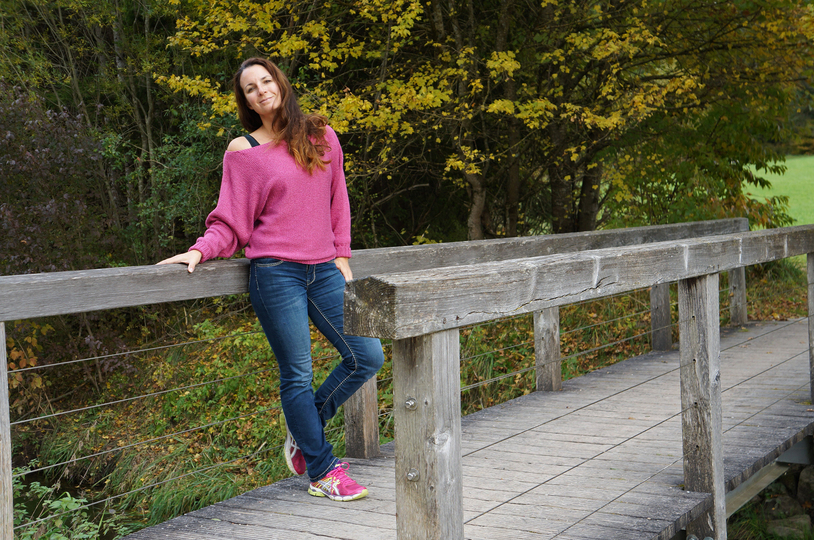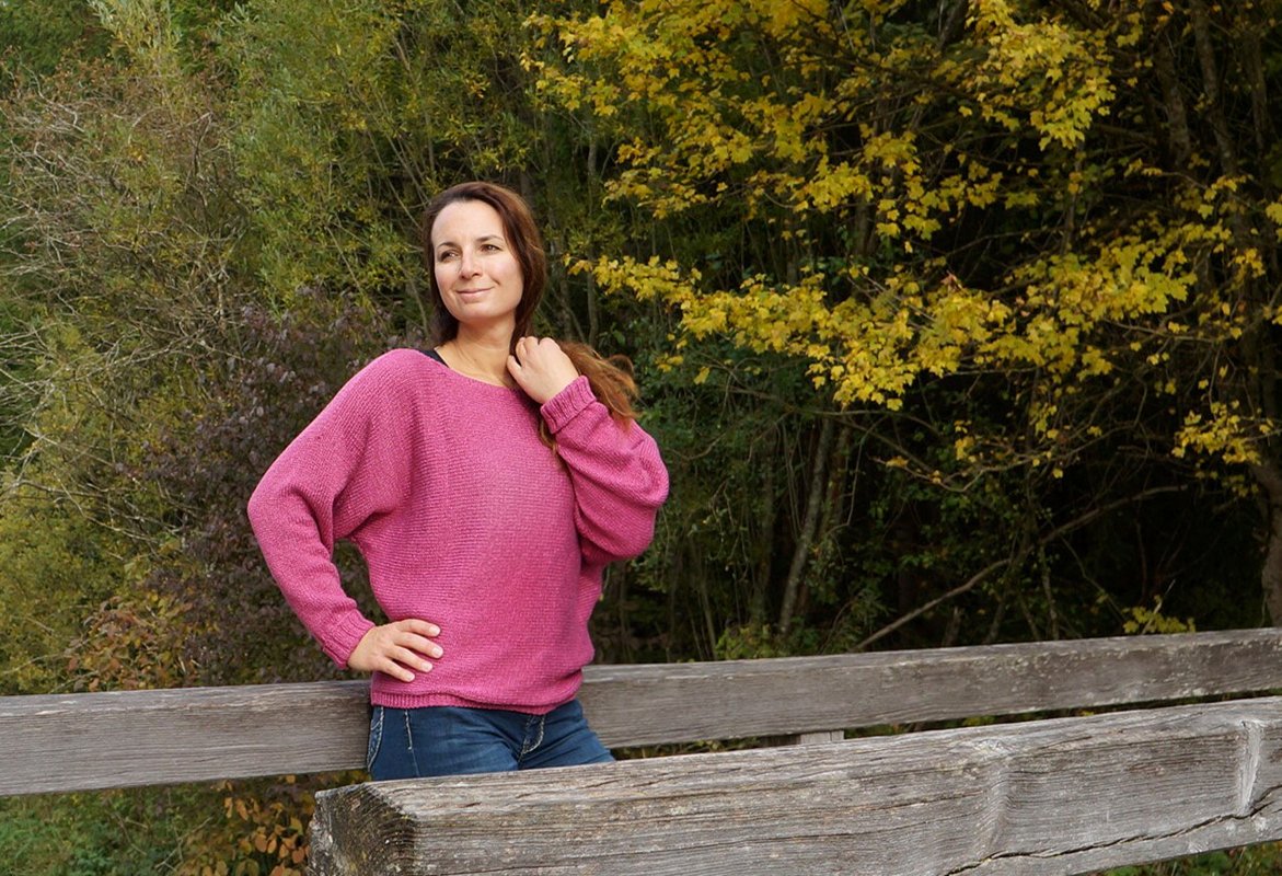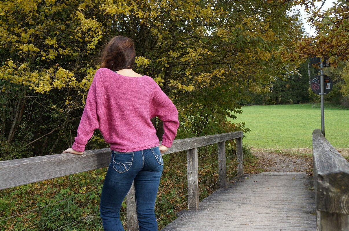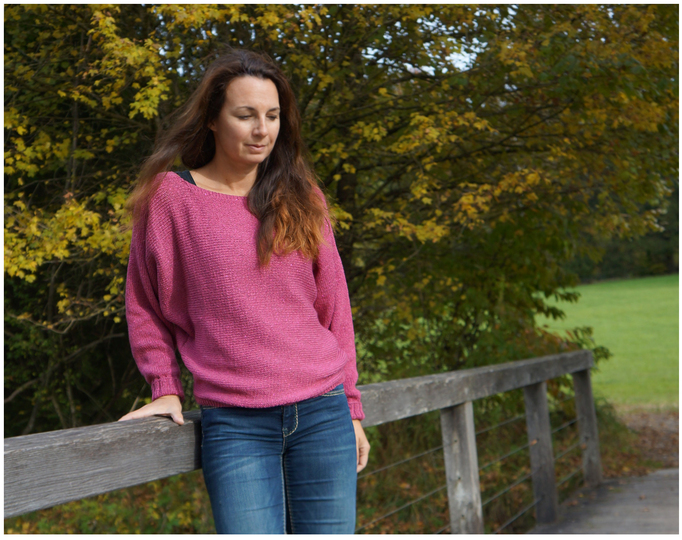 Ich habe den Pullover in normaler Strickdichte gestrickt, könnte mir jedoch auch vorstellen, dass es sich gut macht, wenn man mit einem dünneren Garn und entsprechend größerer Nadelstärke strickt um auf die Maschenprobe zu kommen. Der Pullover ist dann luftiger. Auch einen netten Effekt könnte ein Farbverlaufsgarn haben, da der Pullover von einem zum anderen Ärmel in einem Stück gestrickt wird. Es würden sich bei einem Farbverlaufsgarn somit vertikale Streifen bilden.