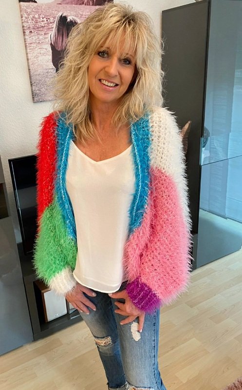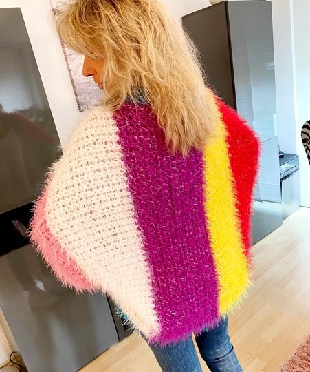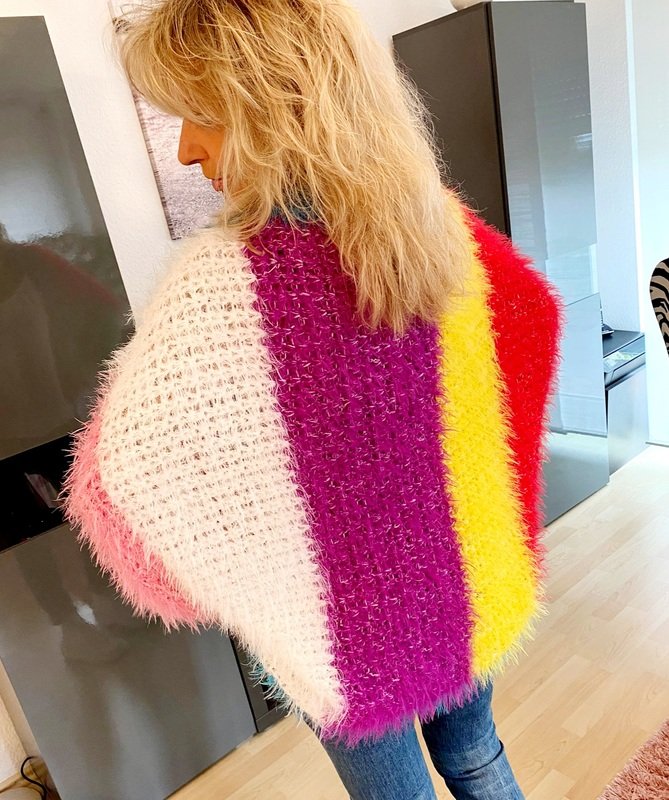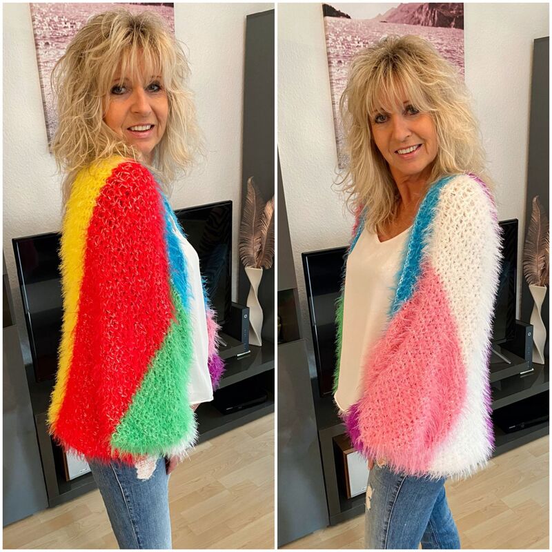3fädig weiß uni + 1 Beilaufgarn Puschel im Wechsel mit allen bunten Farben.