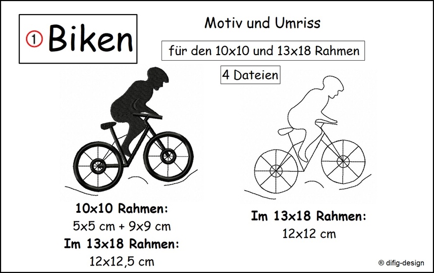Du bekommst zwei Stickdateien zum Thema biken für den 10x10 Rahmen und zwei für den 13x18 Rahmen.