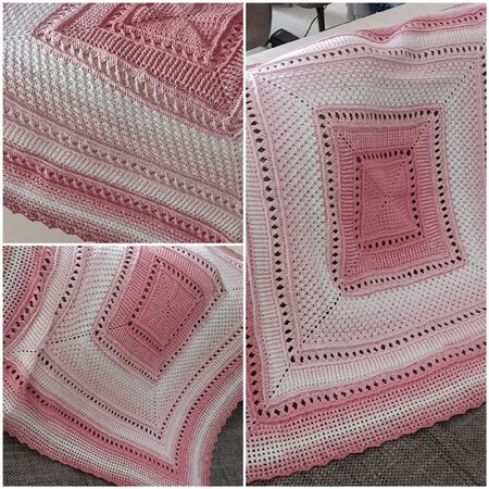 Die Babydecke hat eine Größe von 90x90cm und der Bettüberwurf 2x2m.