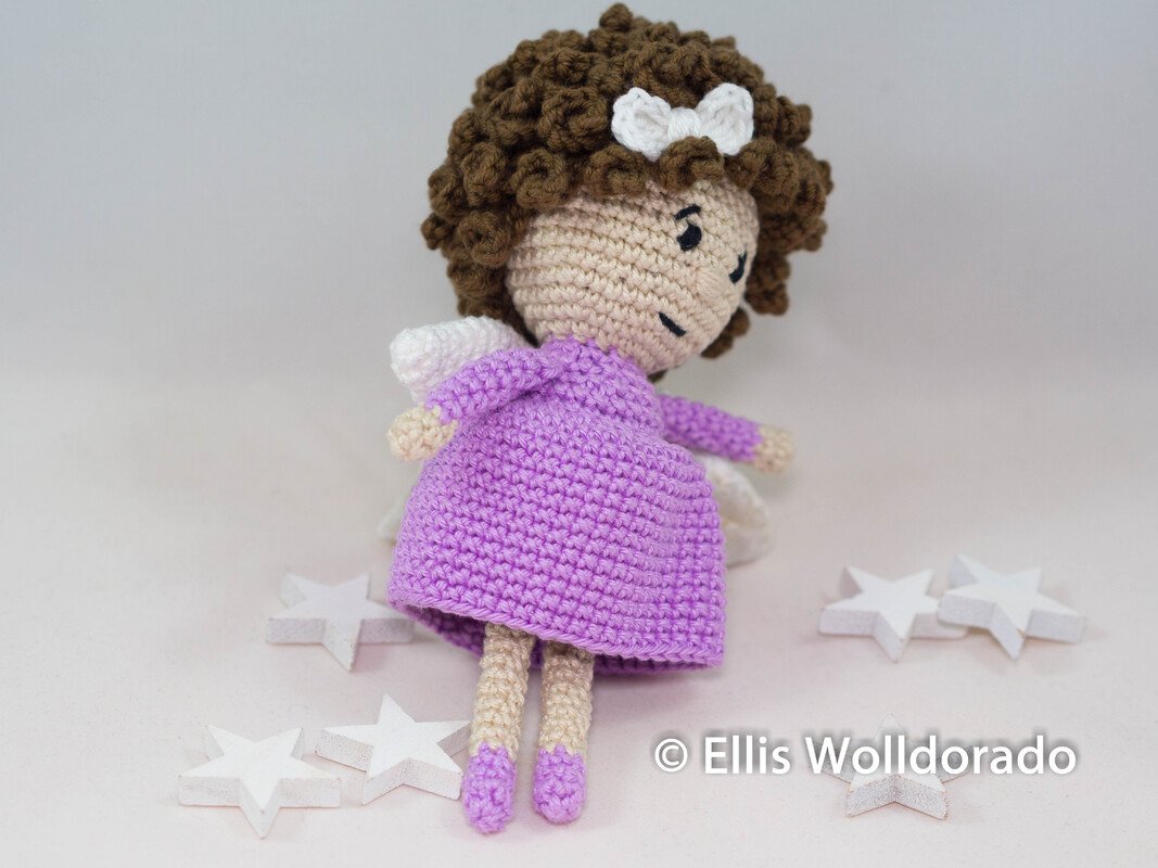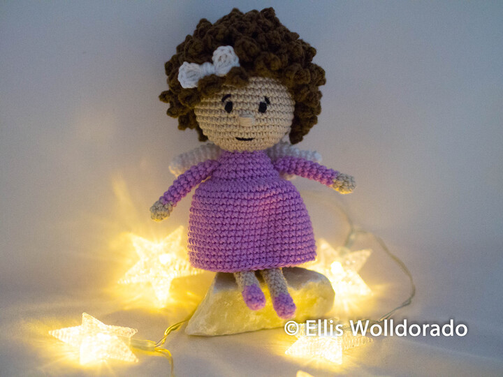 Mit einem Baumwollgarn (Lauflänge 125 m / 50 g) wie z. B. Catania von Schachenmayr, Cotton Quick von Gründl, Miami von RedHeart, Cotone von Lana Grossa oder Carina Baumwolle von G-B und einer Häkelnadel Nr. 2,5 wird das Engel-Püppchen Josy ca. 17,5 cm groß.