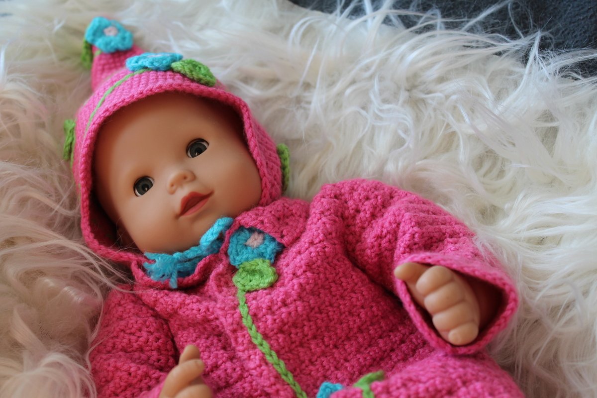 Die Kleidung passt Babypüppchen von 33 bis 46 cm. Für die Modepüppchen, die sehr schlanken Puppen, ist es etwas zu weit.