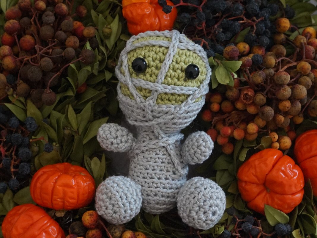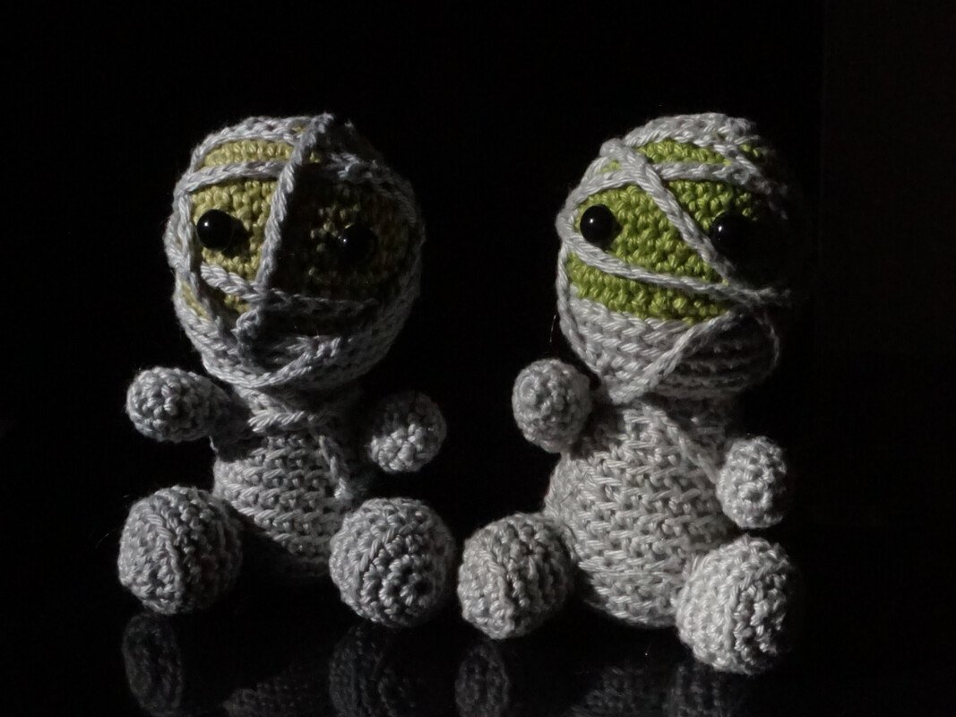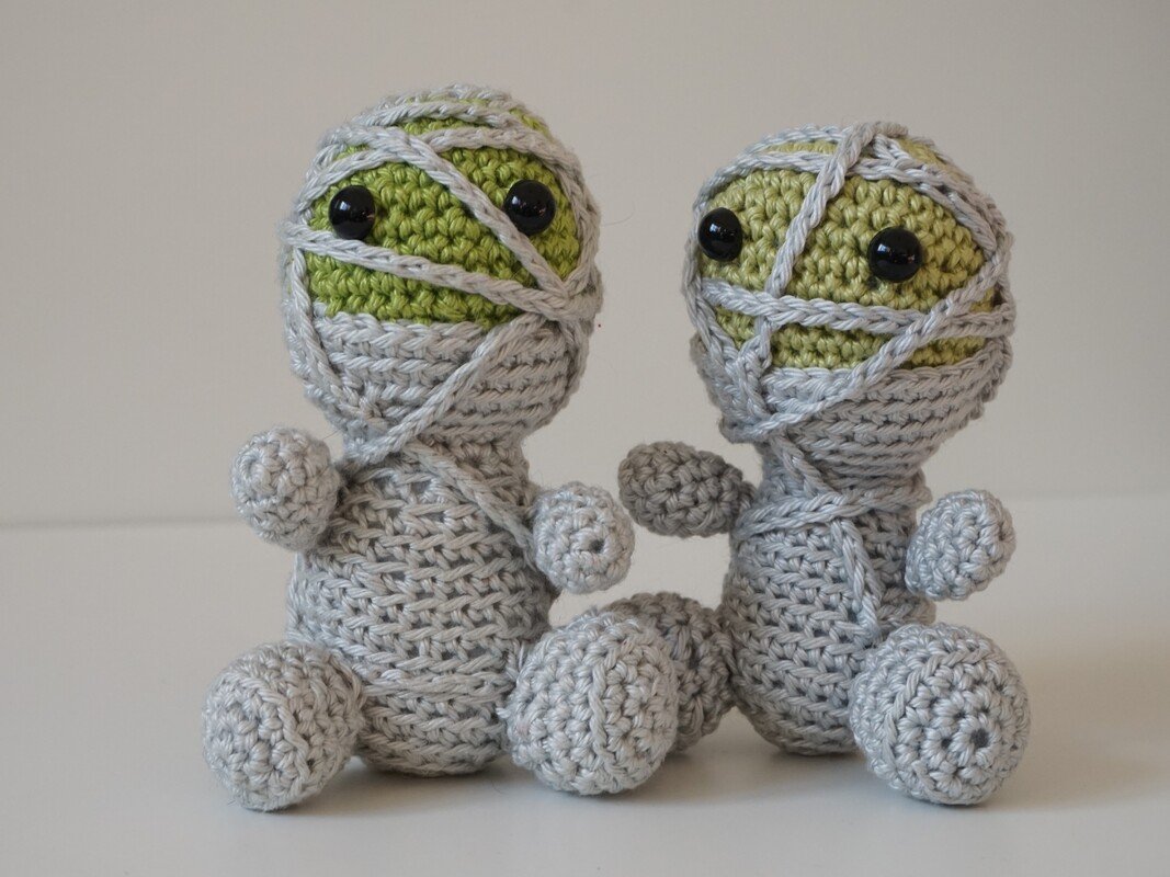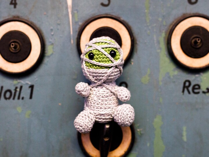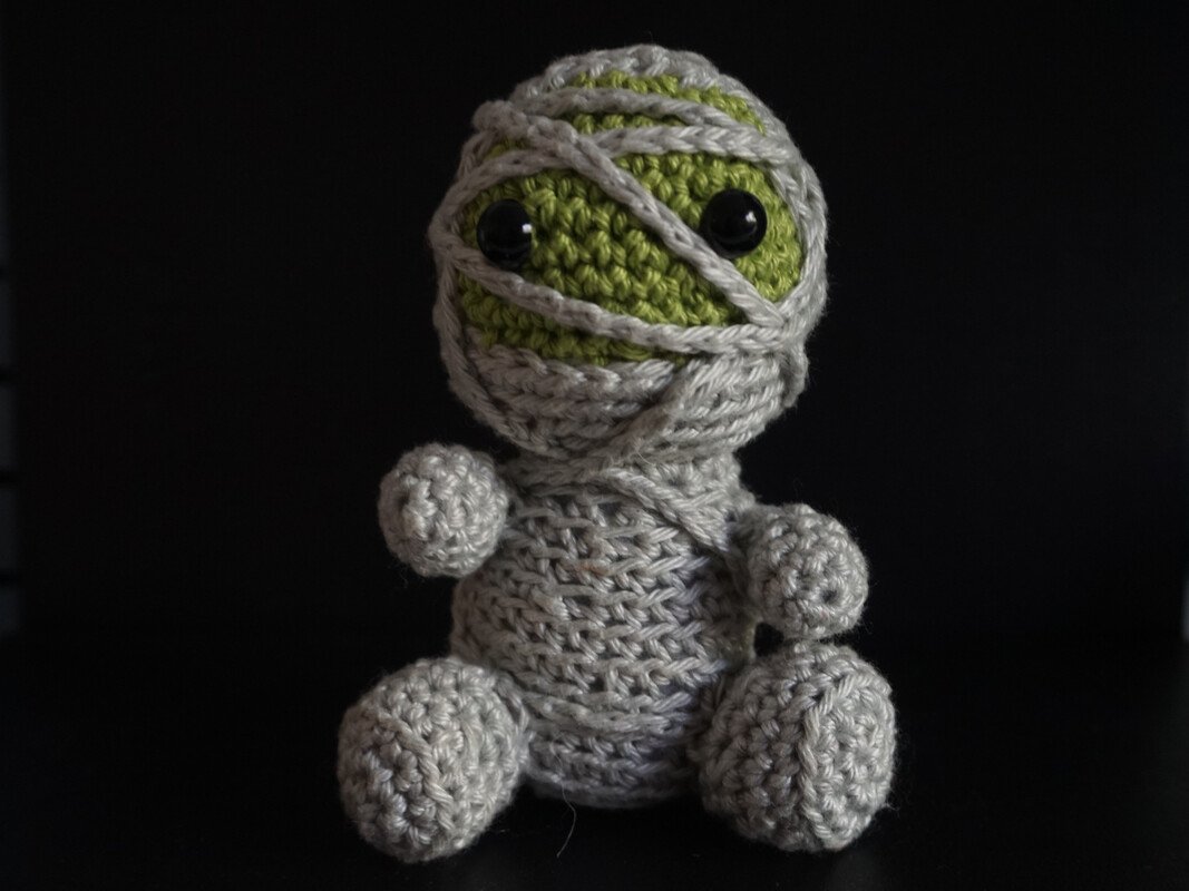 Mit dieser Häkelanleitung kannst du deine eigene kleine Mumie für Halloween anfertigen. Sie eignet sich super für die als Deko auf deiner Halloween-Party.