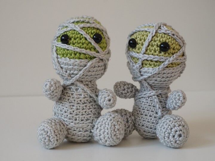 • Die Mumie wird mit einem 100 % Baumwollgarn in 2 Farben gehäkelt (grün, hellgrau); 50 g = 125 m