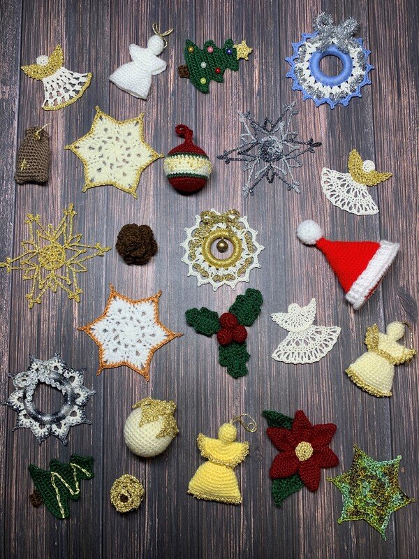 Diese Anleitung beinhaltet 15 verschiedene kleine Anleitungen, um dekorative und süße Weihnachtsdeko zu häkeln – einfache Weihnachtssterne, Zapfen, kleine Engel, Ornamente als Deko oder für den Baum, Weihnachtskugeln, einen Weihnachtsstern…