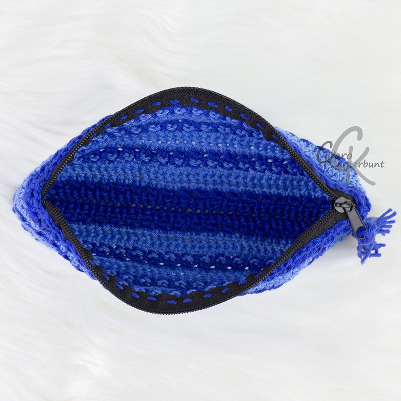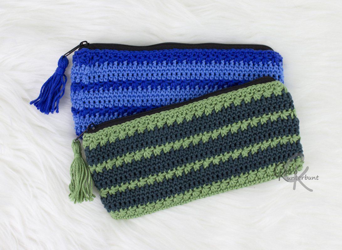 Die Mäppchen auf den Bildern sind mit Baumwollgarn (125m/50g) gehäkelt und ca. 19cm breit und 9cm hoch. In der Anleitung wird allerdings auch beschrieben, wie die Größe vom Mäppchen ganz einfach angepasst werden kann.