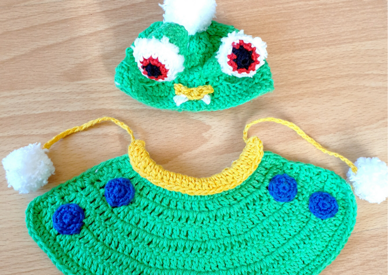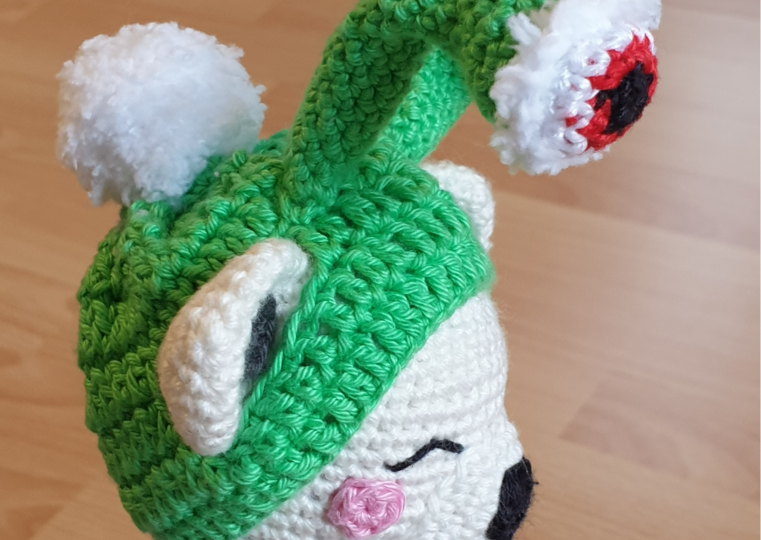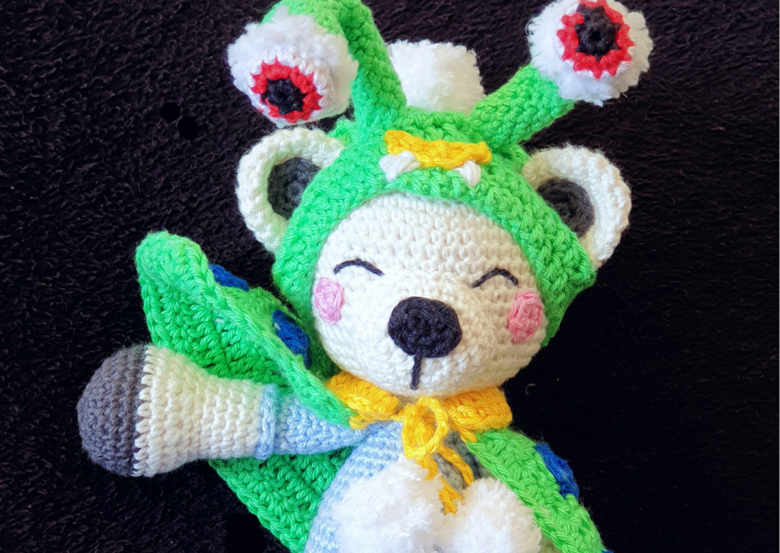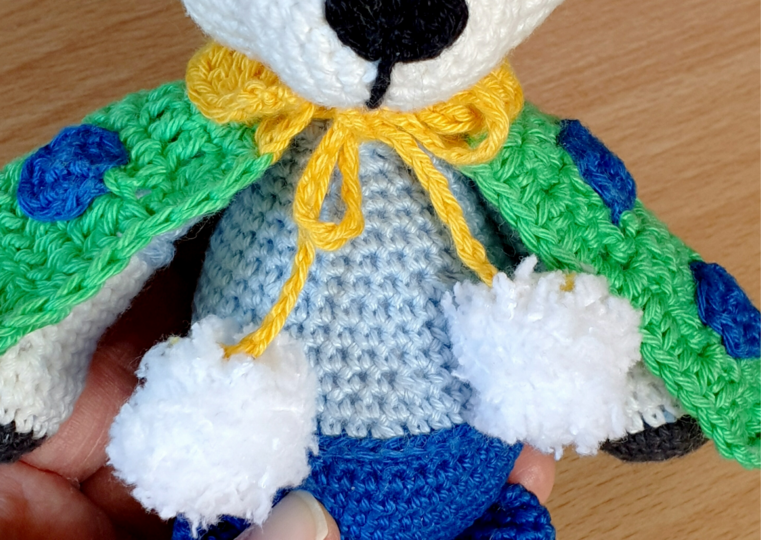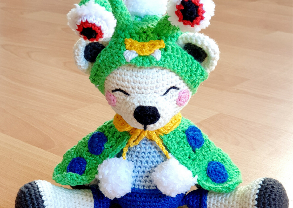 Hier kannst du Eisbär Luis ein Monster-Kostüm häkeln. Damit können die Kinder spielen und zu Halloween oder Fasching ihren Bär verkleiden.