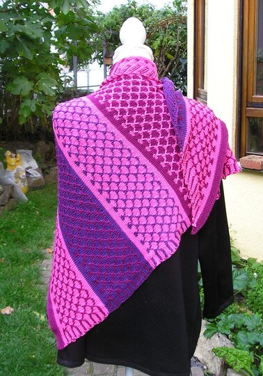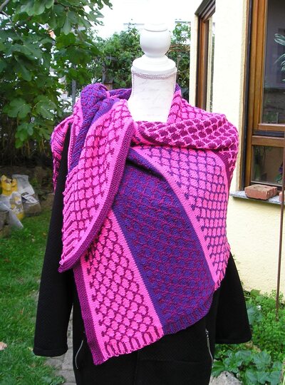 Für das Tuch wird 4-fädiges Baumwollgarn (50% Baumwolle, 50 % Acryl) zu einem asymmetrischen Tuch gestrickt. Das Muster setzt sich aus Streifen mit einem Hebemaschenmuster zusammen. Streifen und Hebemaschen werden in den Farben viola, brombeer und pink gestrickt. Hebemaschen zu stricken geht eigentlich ganz einfach. Da hier lose mitgeführte Fäden fixiert werden müssen, ist das Tuch schon etwas anspruchsvoller, was die Strickkenntnisse angeht.Mit ein bischen Strickübung sollte das aber gut zu bewältigen sein. Bei Fragen helfe ich auch gerne weiter.