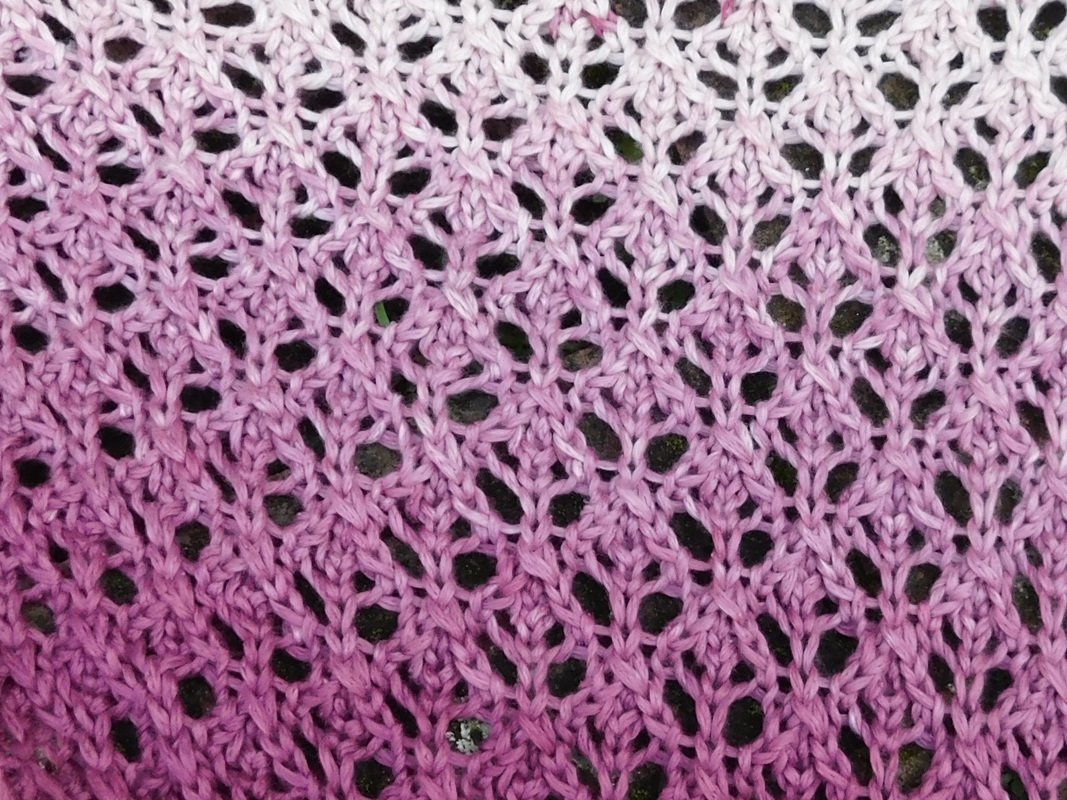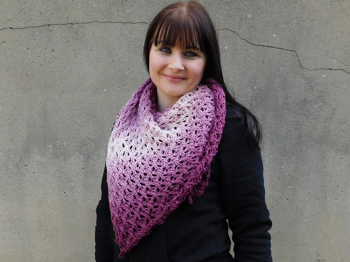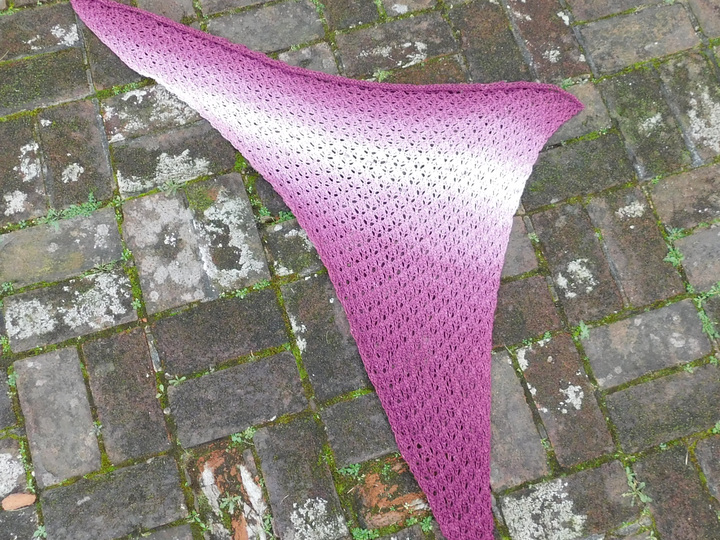 Das Dreieckstuch ist asymetrisch und hat die Maße 100cm x 130cm x 160cm (bei Verwendung des Originalgarns und Originalnadelstärke).