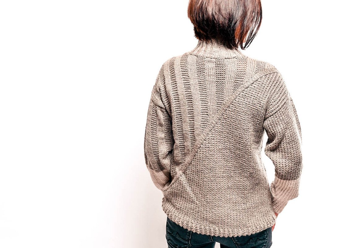 Dieser Pullover ist etwas für richtig kalte Tage! Der Mustermix in Vorder- und Rückenteil ist nicht nur ein Hingucker, es sorgt auch dafür, dass beim Stricken keine Langeweile aufkommt. Die einzelnen Rippenmuster werden durch einen Diagonalstreifen voneinander getrennt, die Teile werden einzeln gestrickt und anschließend zusammengenäht. Bei diesem Modell wurden die Ärmel zweifarbig gestrickt, wer mag, kann aber natürlich auch bei einer Farbe bleiben.