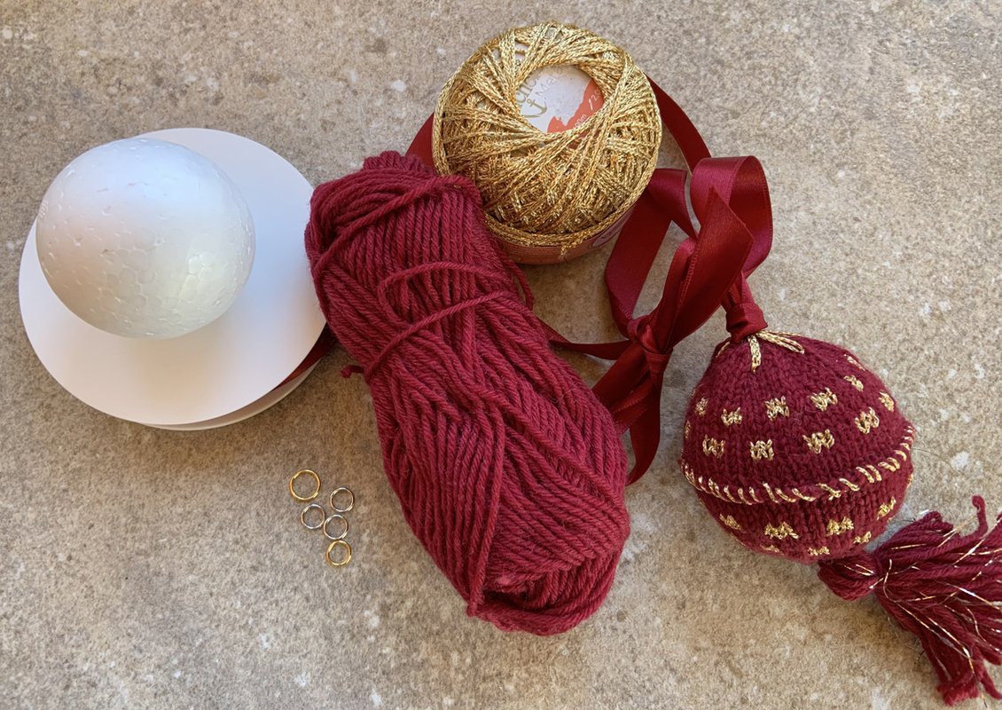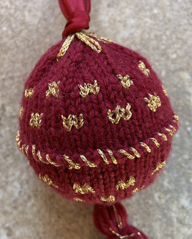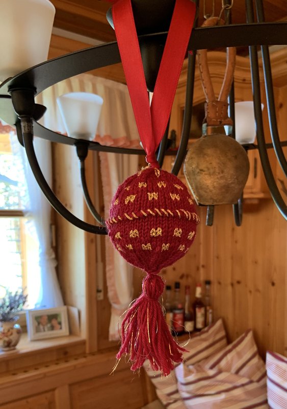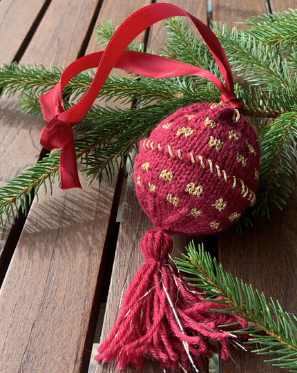 Weihnachtsdeko in Form einer gestrickten Weihnachtskugel - zum Schmücken des Weihnachtsbaumes, eines Tannenzweigs oder als kleines Geschenk.