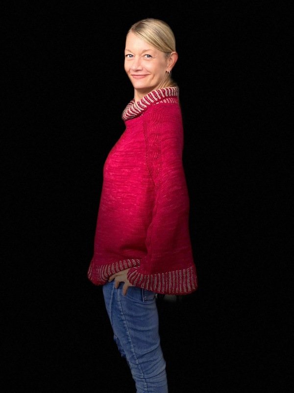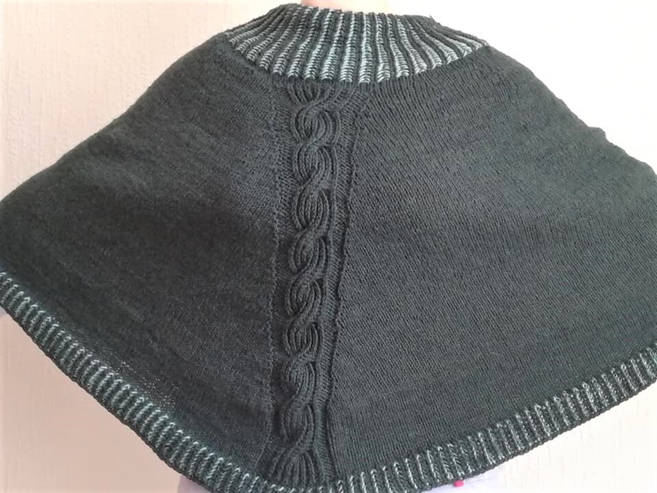 Das Zopfmuster mittendrin teilt den Poncho optisch, man kann ihn aber auch so tragen, das der Zopf auf den Ärmeln liegt.