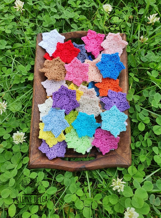 Ich zeige dir in dieser Anleitung, wie du ganz schnell und einfach aus deinen Wollresten total tolle Sternblümchen häkeln kannst. Die Blümchen passen je nach verwendetem Garn und Farbe zu jeder Jahreszeit und jedem Anlass.