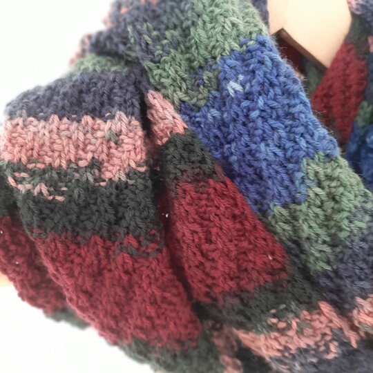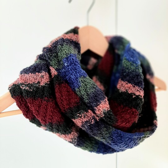 Durch rechte und linke Maschen entsteht ein tolles Muster, das ganz einfach nach zu stricken ist. Der gleichmäßige ICord-Rand wird gleich mit gestrickt. Das Design ist unisex und durch selbstmusternde Sockenwolle können individuelle Akzente gesetzt werden. Der Loop kann in verschiedenen Varianten getragen werden und bei schlechtem Wetter auch die Ohren und den Kopf als Haube wärmen.