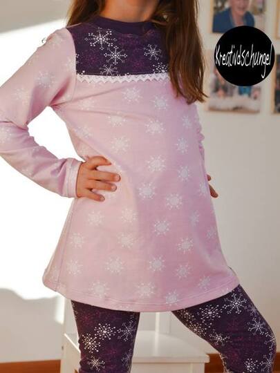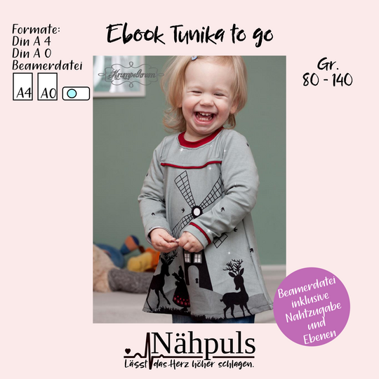 Das Schnittmuster Tunika to go ist für eine schnell genähte Tunika und für dehnbare Materialien konzipiert. Hervorragend eignet sich dafür Jersey und Sommersweat, aber auch French Terry, Strick, Nicki, sowie dünnere Wintersweats. Die Tunika ist in den Einzelgrößen 80 bis 140 gradiert und für schmal bis normal gebaute Mädchen geeignet. Sie umspielt leicht schwingend die Hüftpartie. Im Vorderteil ist eine runde Teilung eingebaut, die sich optimal eignet dehnbare Paspeln, wie z.B. Falzgummi mit einzunähen.