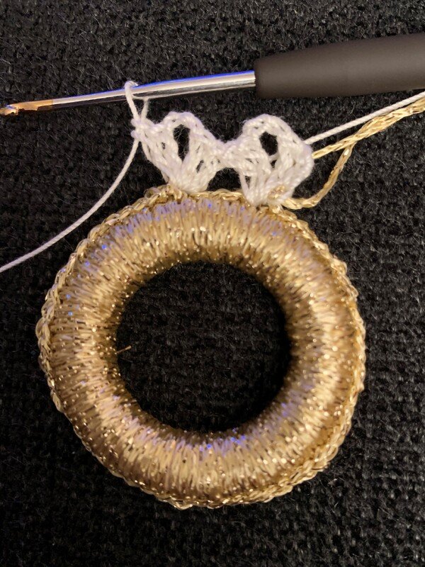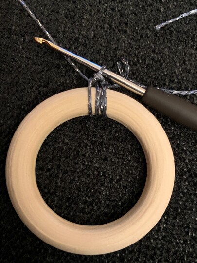 Die fertigen Ornamente haben einen Durchmesser von 9 cm, wenn du die in der Anleitung vorgeschlagene Wolle verwendest. Die Ornamente können leicht größer/kleiner gehäkelt werden, wenn du größere oder kleinere Holzringe verwendest, da angegeben ist, wie du die Anzahl der Maschen entsprechend verändern musst.
