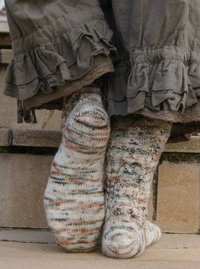 Die Originalsocken wurden im Broken Rib Muster (1. Rd 2reM, 2liM / 2. Rd reM) gestrickt, die Socke wird schmaler, wenn man dafür das normale Rippenmuster (2reM, 2liM) benutzt (siehe Foto Seite ).