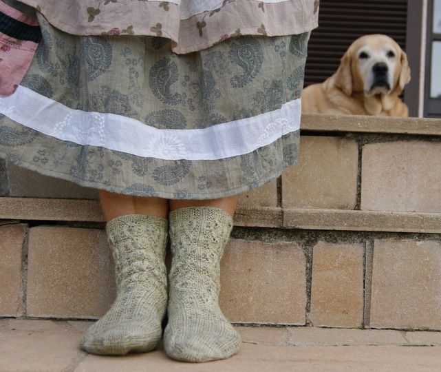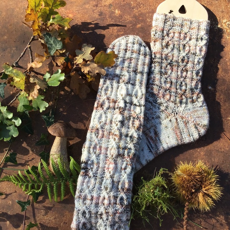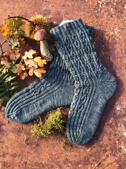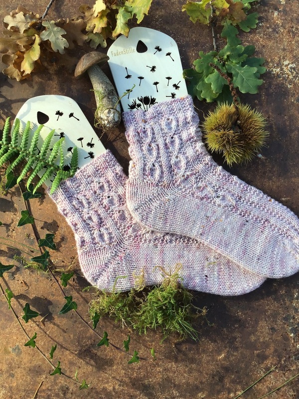 Die Waldläufer Socken werden vom Bund abwärts auf Crazy Trio-Nadeln oder einer Rundstricknadel (Magic-Loop-Methode) in Runden gearbeitet. Der Schaft wird in einem Blattmuster gestrickt. Dieses Muster geht in den Oberfuß über und läuft im Broken Rib Muster aus. Da sich das Muster zusammen zieht, entsteht eine fussgerechte Passform, so dass die Socke angenehm sitzt.