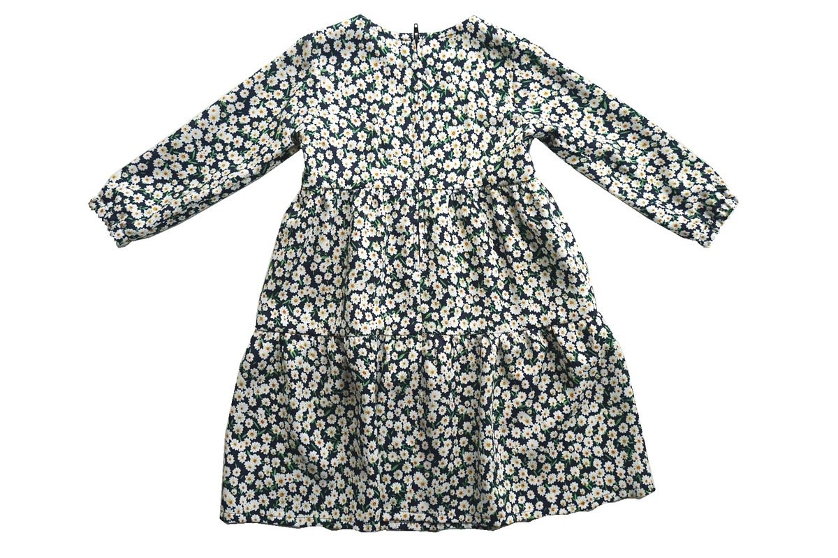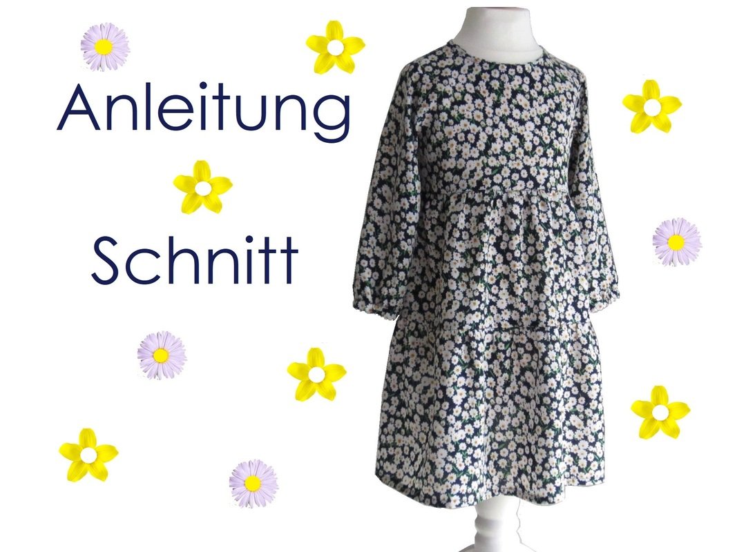 Schnittmuster für ein trendiges Kleid mit 2 gekräuselten Rockstufen, so dass eine A-Linie entsteht. Das Kleid ist vorne ganz schlicht und wird im Rücken mit einem Reißverschluss verschlossen. Die Länge geht über das Knie bis zur Wade. Der lange Ärmel hat am Saum ein Gummibündchen, dadurch fällt er schön und man kann ihn hochschieben. Sie können den Ärmelschnitt übrigens auf jede gewünschte Länge kürzen, die Verarbeitung bleibt gleich.