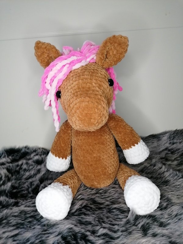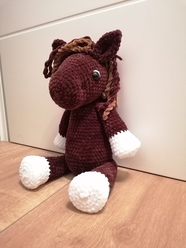 Ein Kuschliges Plüschperd, dass schnell und einfach zu häkeln ist,mit einer stolzen größe von 35cm (sitzend).